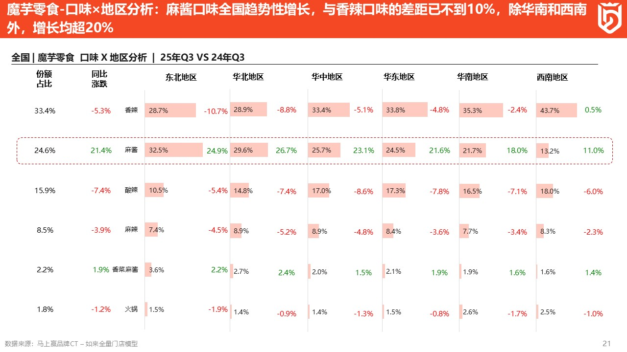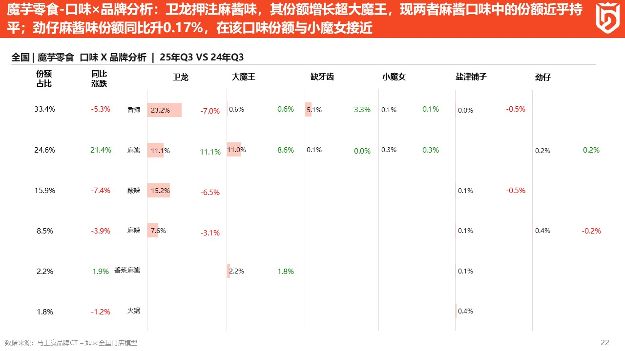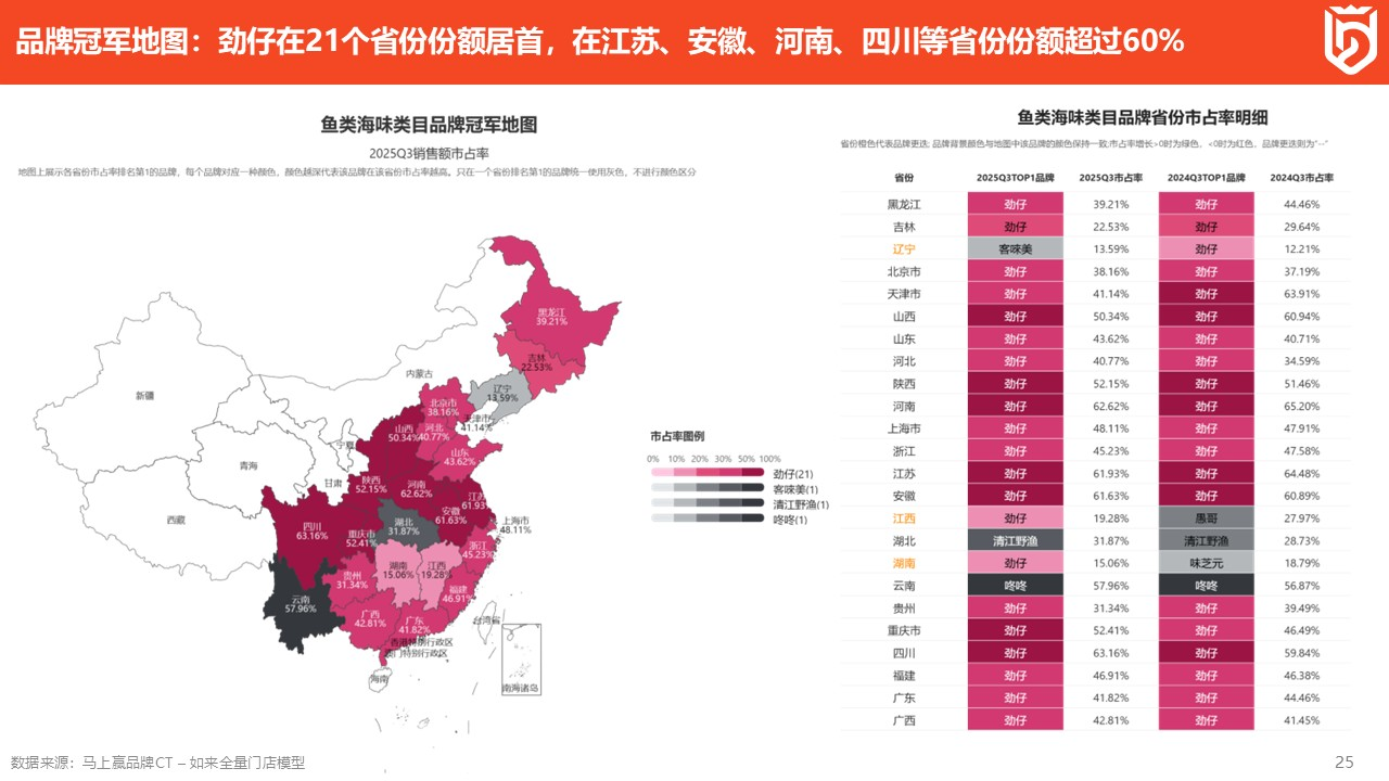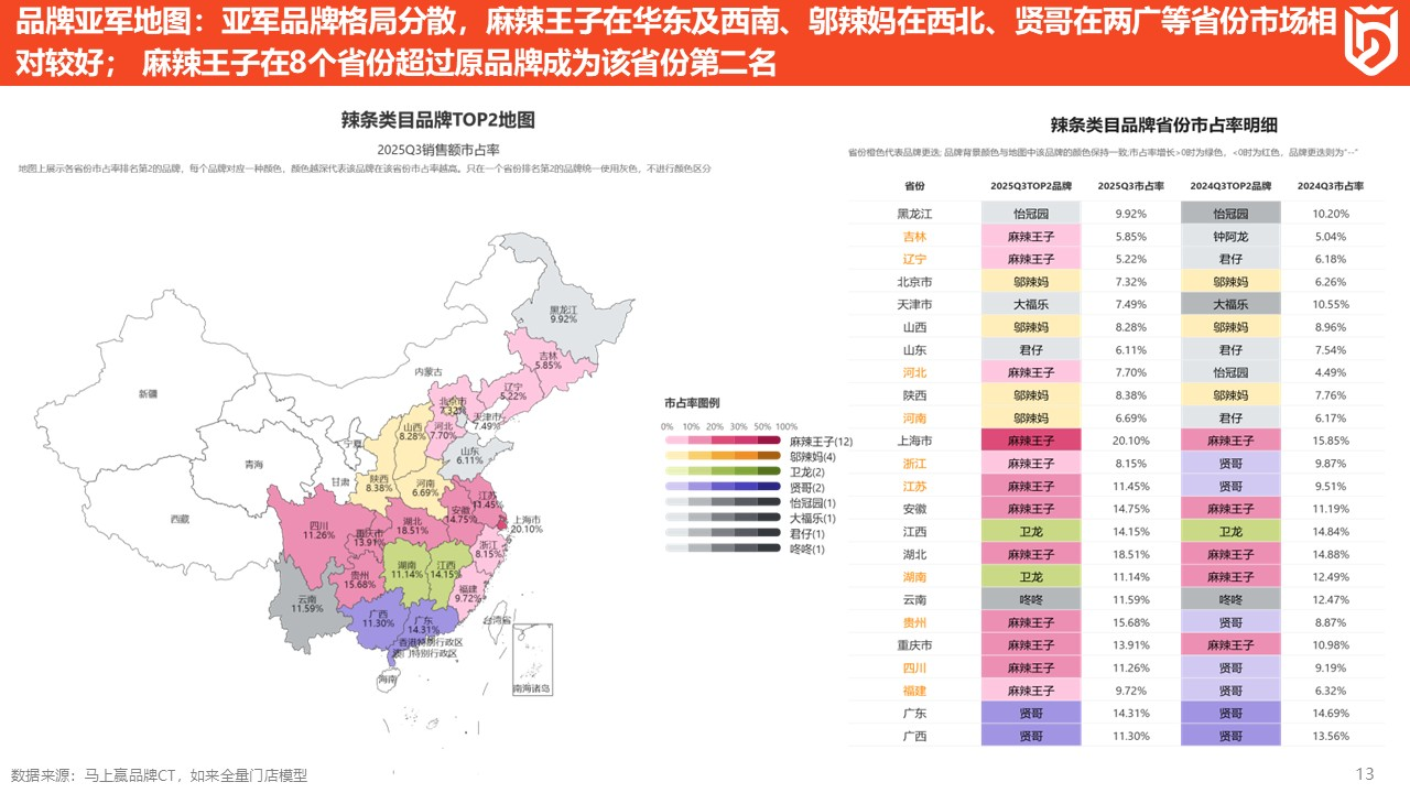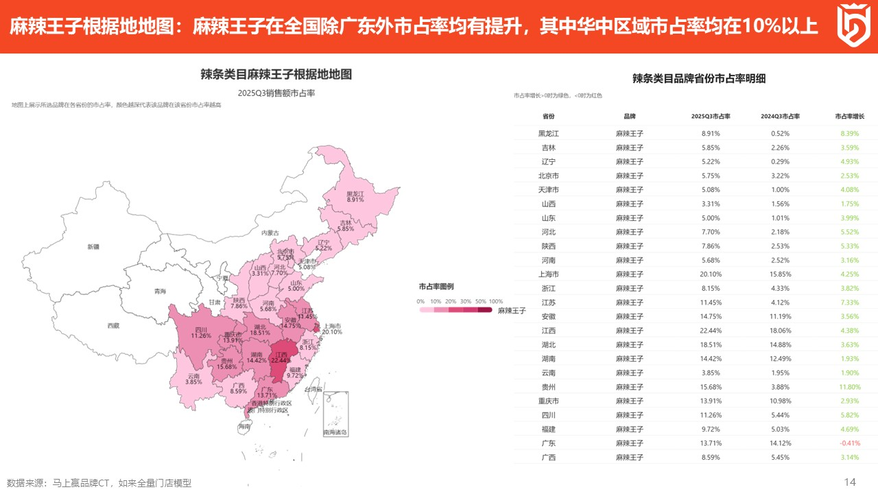 展开看麻辣王子2025年Q3的根据地地图,颜色越深表示份额越大表现,可以看到它在长江沿岸省份的份额非常大,在全国其他省份也均有布局。特别要强调的是,最右边的绿色数字表示该省份份额在增长,也就是说在全国的24个省份中,除了广东省,麻辣王子在其余23个省份的市场份额都有大幅度增长。这得益于两方面:一是产品定位与品牌力上升,清晰的产品定位与品牌宣传推广活动取得了很好的效果;二是积极拓展线下渠道市场,效果非常显著。