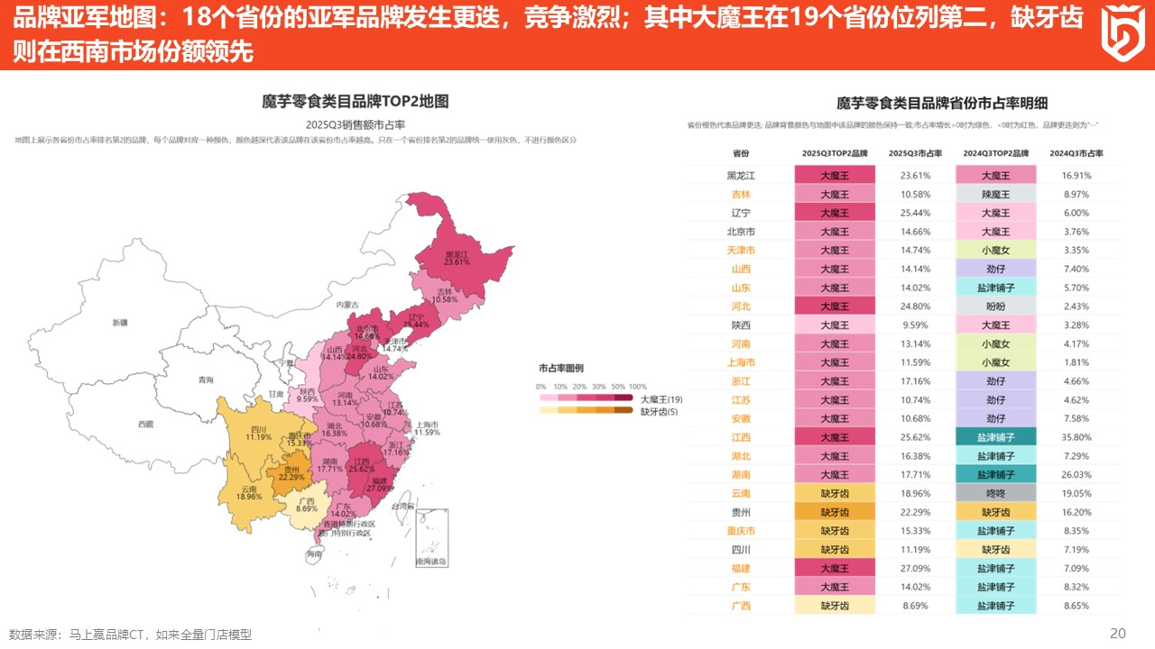品牌亚军的分布则包含着更多的信息量:呈现东西部分割——东部是大魔王,西部的四川、重庆、云南、广西等省份是缺牙齿。而且,大魔王在多个省份替代了劲仔,整体的成长非常迅速。