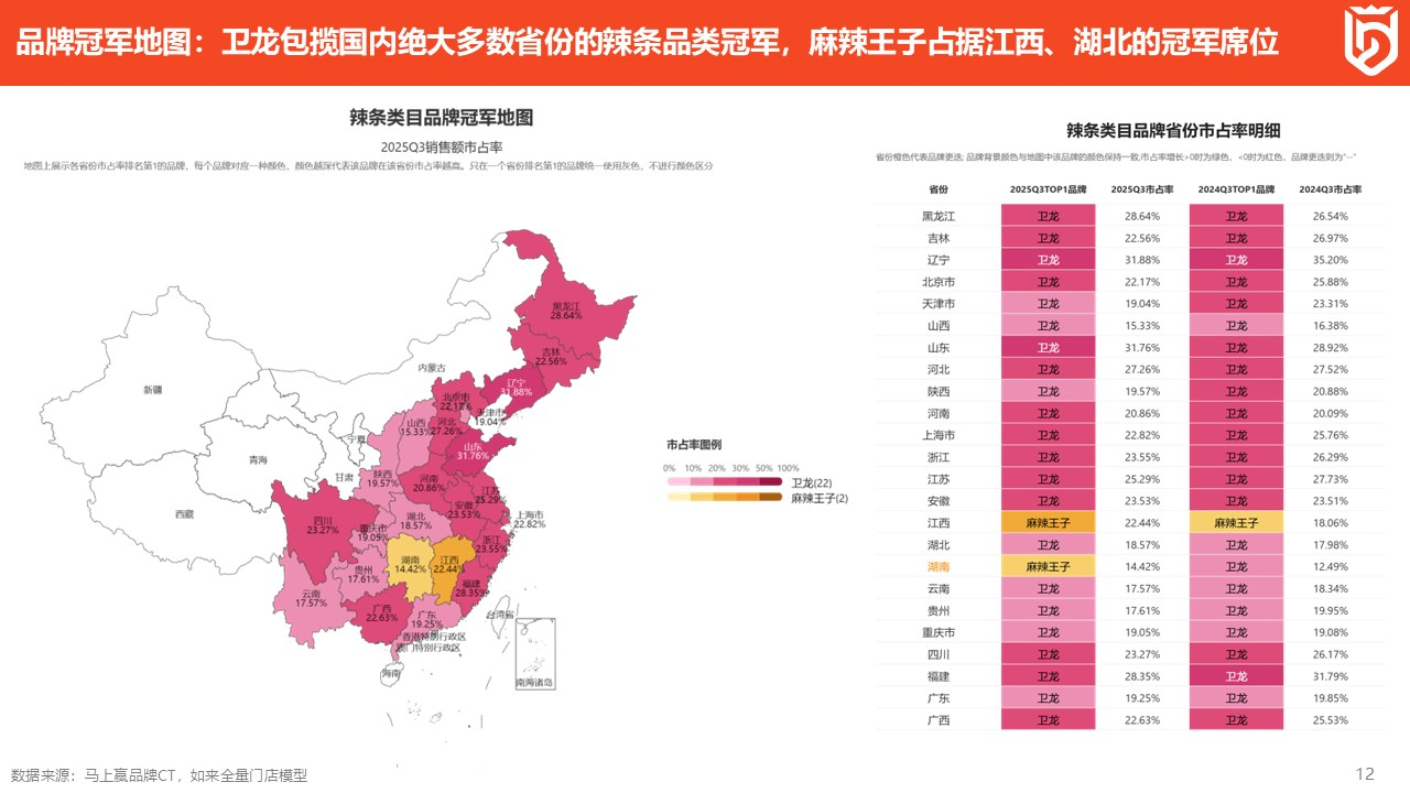 分省来看辣条类目中的冠军品牌及两个不同时间段的变化,可以看到,卫龙在绝大多数省份依然位居第一且保持着相当的市场份额优势,但在江西,麻辣王子在两个季度一直处于领先。另一个值得关注的是,在非常喜辣的湖南,麻辣王子在2025Q3终于取得了市场份额第一,可见两个品牌的不同口味方向还是会显著影响不同口味喜好消费者的产品选择。