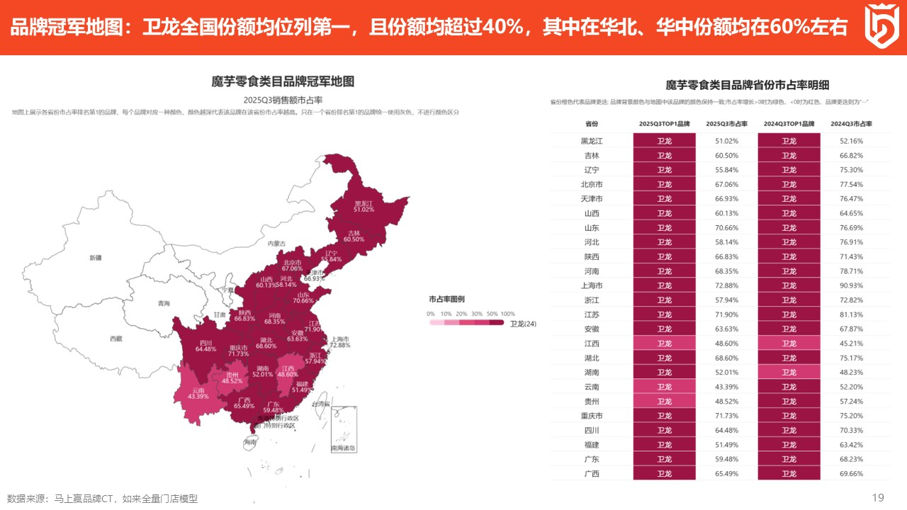 从魔芋零食的品牌冠军地图来看,卫龙在全国24个省份都很强势,尤其是北方、华北地区,市场份额甚至能占到60%,对于市场的掌控能力非常的强。