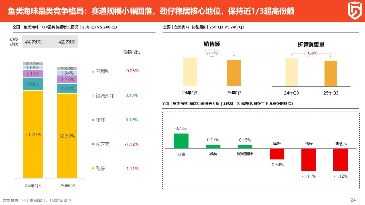 品类的代表性品牌是劲仔,劲仔在该赛道占据将近1/3的市场份额,后续品牌还有味芝元、咚咚、银城湘味等,多为区域化品牌。相对来说,劲仔是全国品牌,其口味和工艺有独特优势,尤其是工艺能保持小鱼仔的韧性,在运输过程中不会粉碎,因此有着很高的产品工艺壁垒。从类目内的市场份额来看,劲仔相对于第二名、第三名呈现断崖式领先,这也体现出劲仔集团产品和工艺的独特优势。