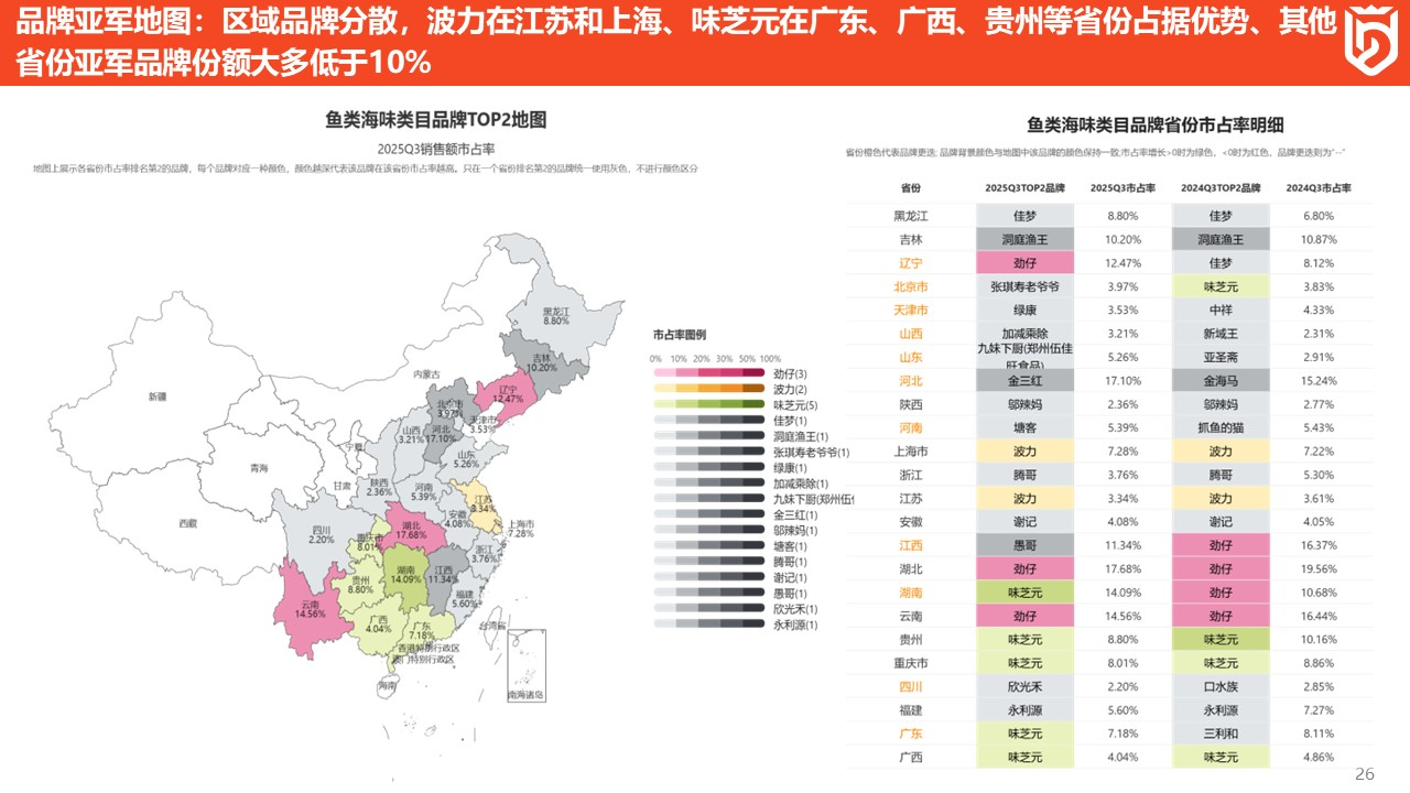 品牌亚军则没有绝对头部,值得关注的是波力,其在江苏、上海占据较好的市场份额;味芝元在贵州、湖南、广东、广西也有一定市场体量。