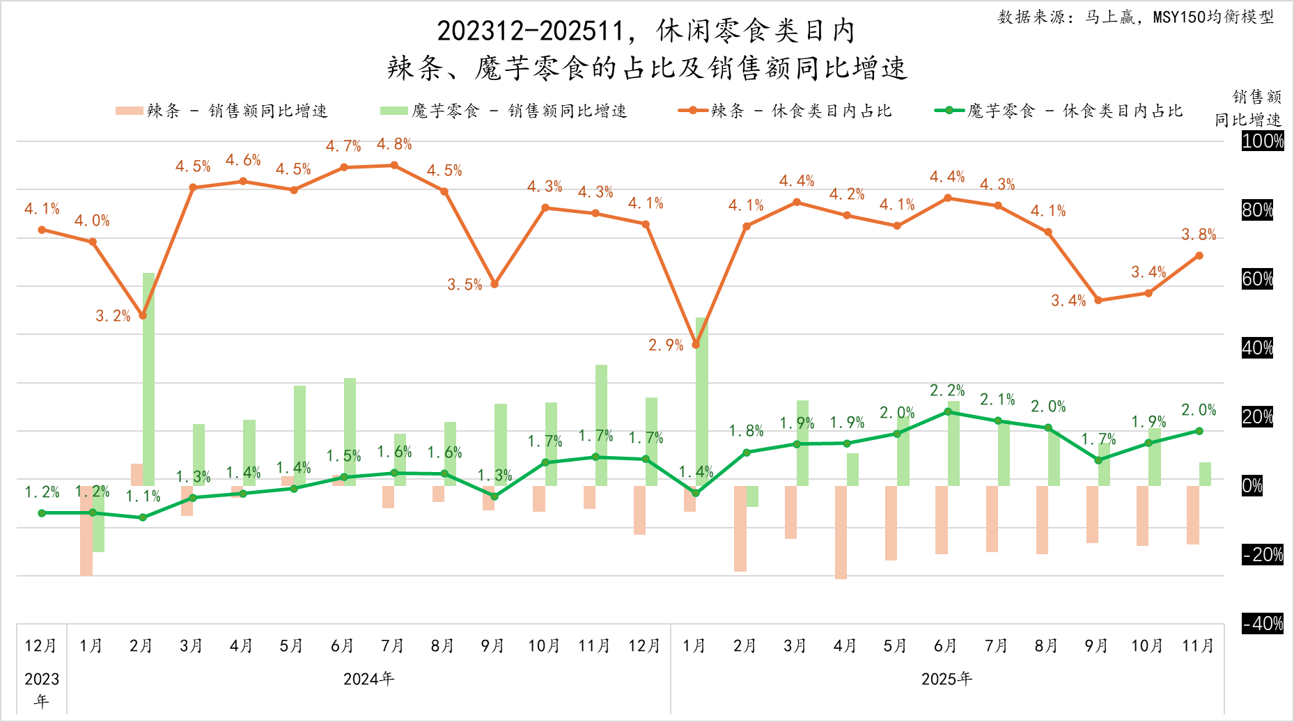复盘数据均来自于马上赢品牌CT,马上赢MSY150均衡模型。马上赢品牌CT数据覆盖了全国各个城市,涉及绝大部分区县级行政区域(不含乡、镇、村级行政区域),渠道业态包括大卖场、大超市、小超市、便利店、食杂店。目前,马上赢品牌CT中的品牌超30万个,商品条码量超过1000万个,年订单数超过50亿笔。另需说明的是,下述数据中对于休闲零食大类的定义中,均不包含“槟榔”类型产品。