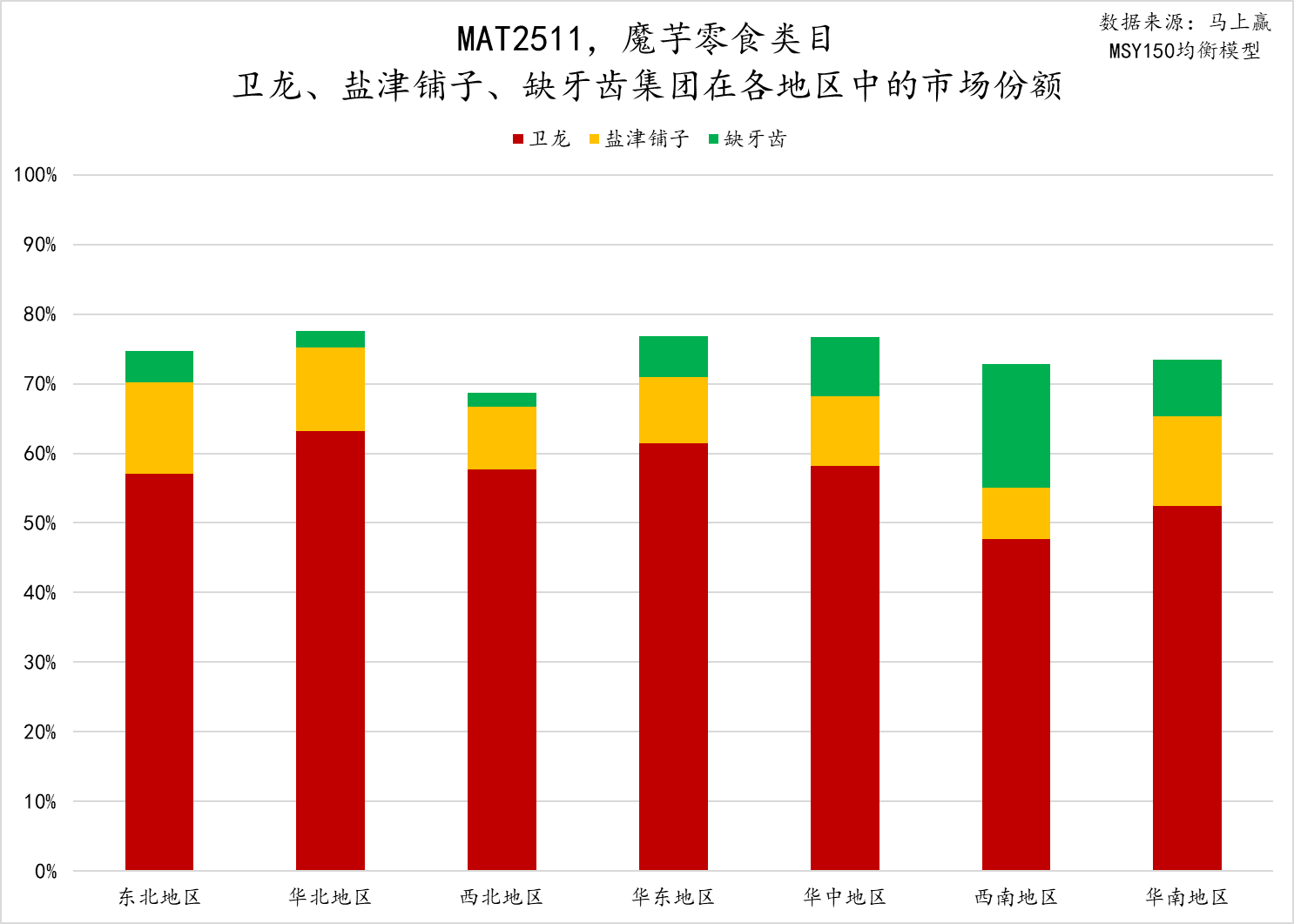 接下来看三个集团在不同地区的市场表现。华北、西北地区的格局较为相似,卫龙占据超60%市场份额,盐津铺子则在第二,缺牙齿占比很低。东北、华东、华中和华南地区的格局较为接近,卫龙占据超50%的市场份额,盐津铺子市场份额超10%,缺牙齿则在10%以内,其中华中和华南地区超过5%。西南地区则表现与其他地区有较大的不同,是卫龙和盐津铺子市场份额最低的区域,卫龙低于50%,盐津铺子低于10%,而缺牙齿市场份额则超过15%,或许这也与缺牙齿重辣的定位与地区消费者的口味偏好有很强的相关性。