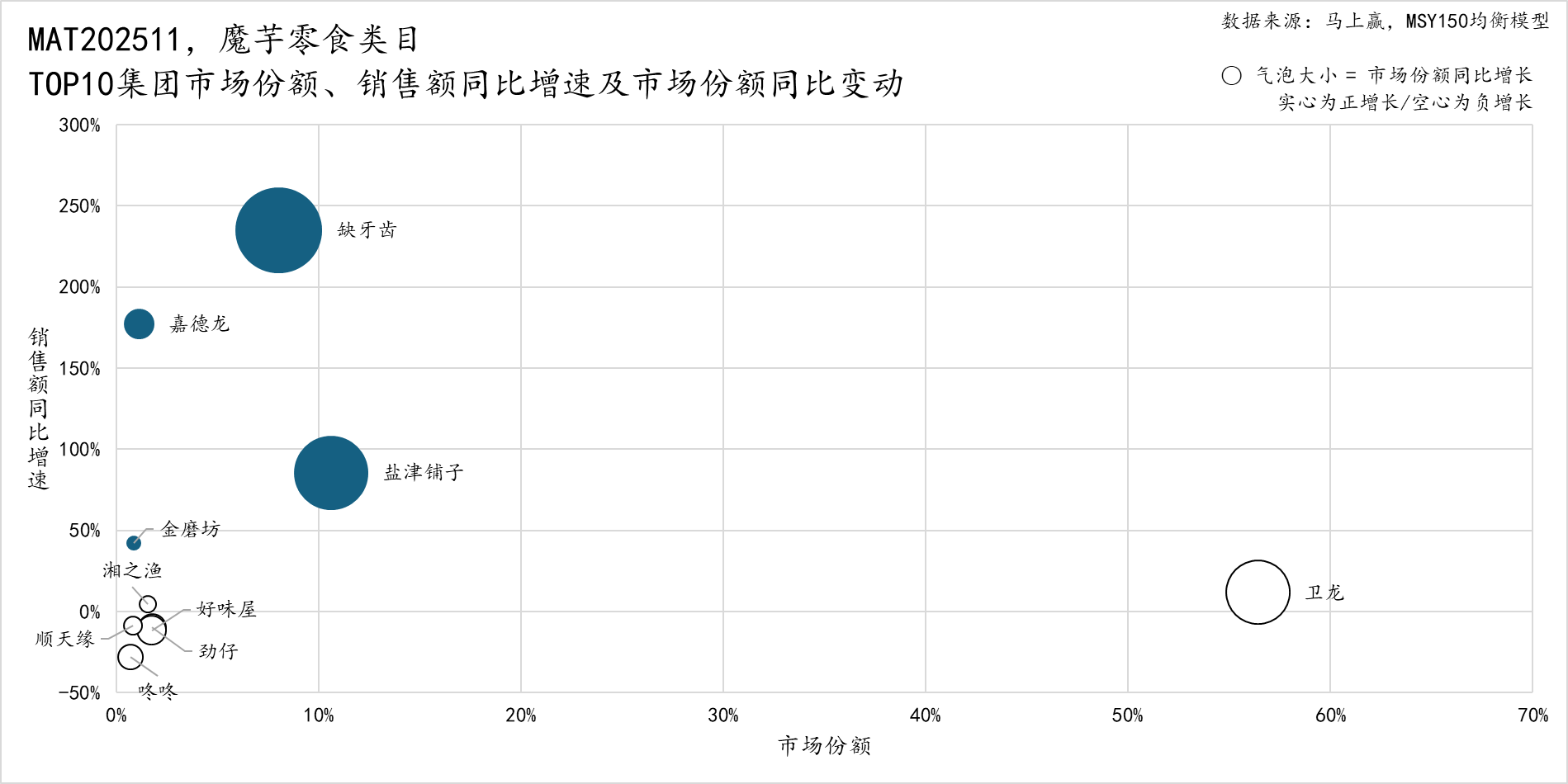 从集团维度的市场格局来看,在MAT202511时间段中,卫龙的市场份额依然超过50%,呈现一家独大,但其销售额同比增速表现并不亮眼,虽为正但并不突出。受到类目快速扩张的影响,其市场份额也出现了较大的同比负增长;相比来说,其后排名第二的盐津铺子、以及排名第三的缺牙齿,市场份额虽然还都较小仅10%上下,但销售额同比增速、市场份额同比增长都更为显著,缺牙齿更是以超过200%的销售额同比增速在所有集团中同比增速名列第一,盐津铺子的销售额同比增速也接近100%;第4-10名的集团整体份额都较小,其中仅有嘉德龙表现较为亮眼,销售额同比增速超过150%。
