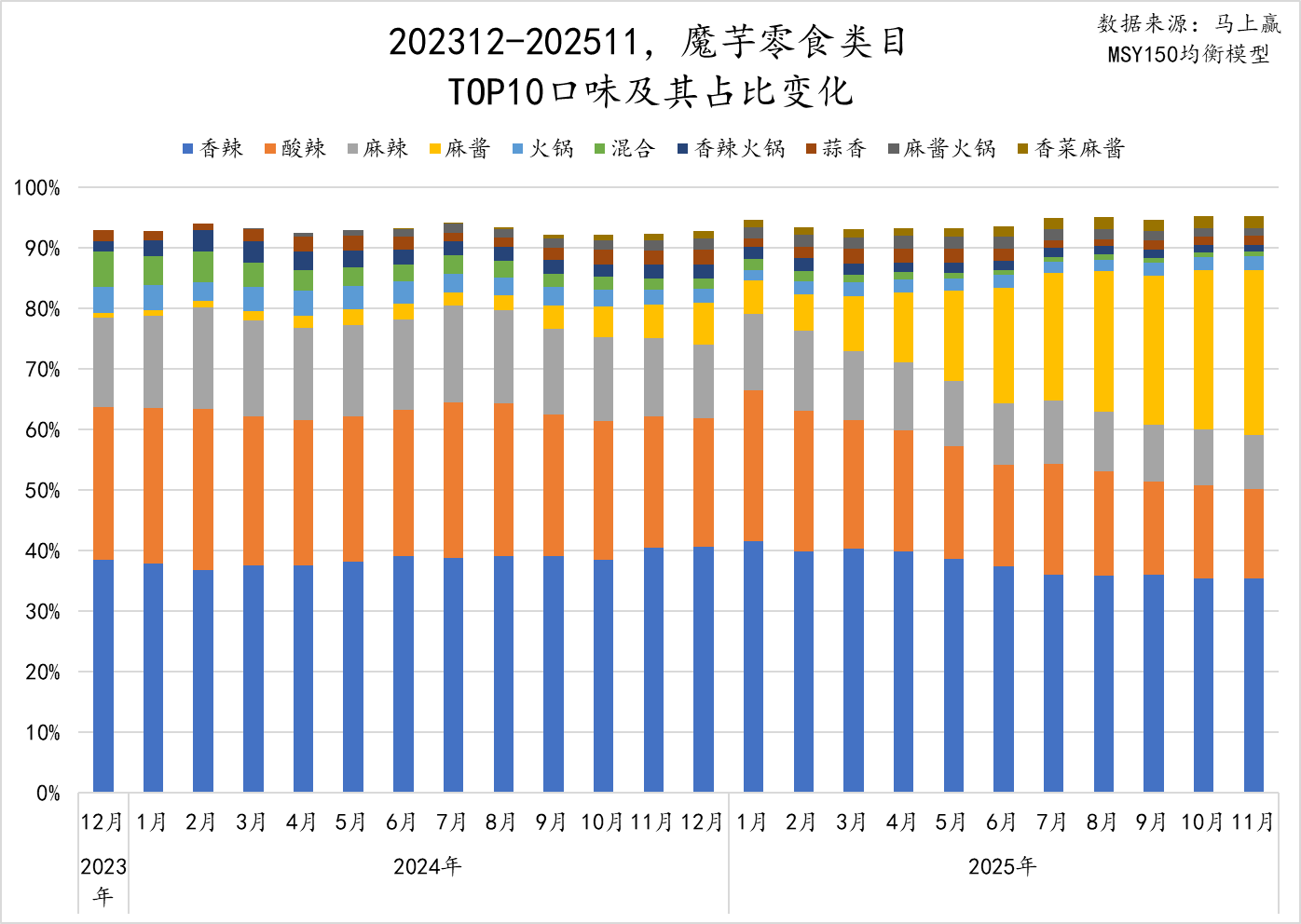 你方唱罢我登场。休闲零食类目近几年在零食量贩的价格快刀下,已经鲜有如此“针锋相对”的场面出现了,卫龙与盐津铺子、魔芋爽与素毛肚,2026年似乎将会全面开战。反观魔芋零食,这一类型产品也并不新鲜,乘上了什么东风才迎来了快速的增长?本周,也是马上赢情报站2025年的最后一篇稿件,我们将带您数读「魔芋零食」。