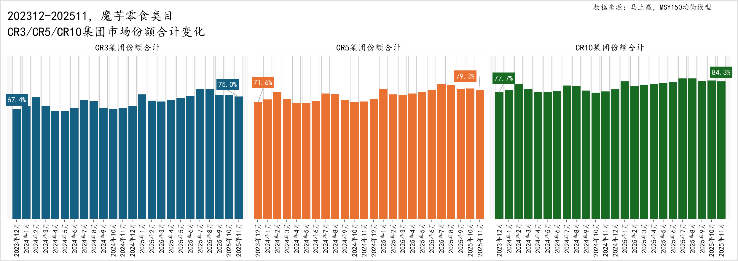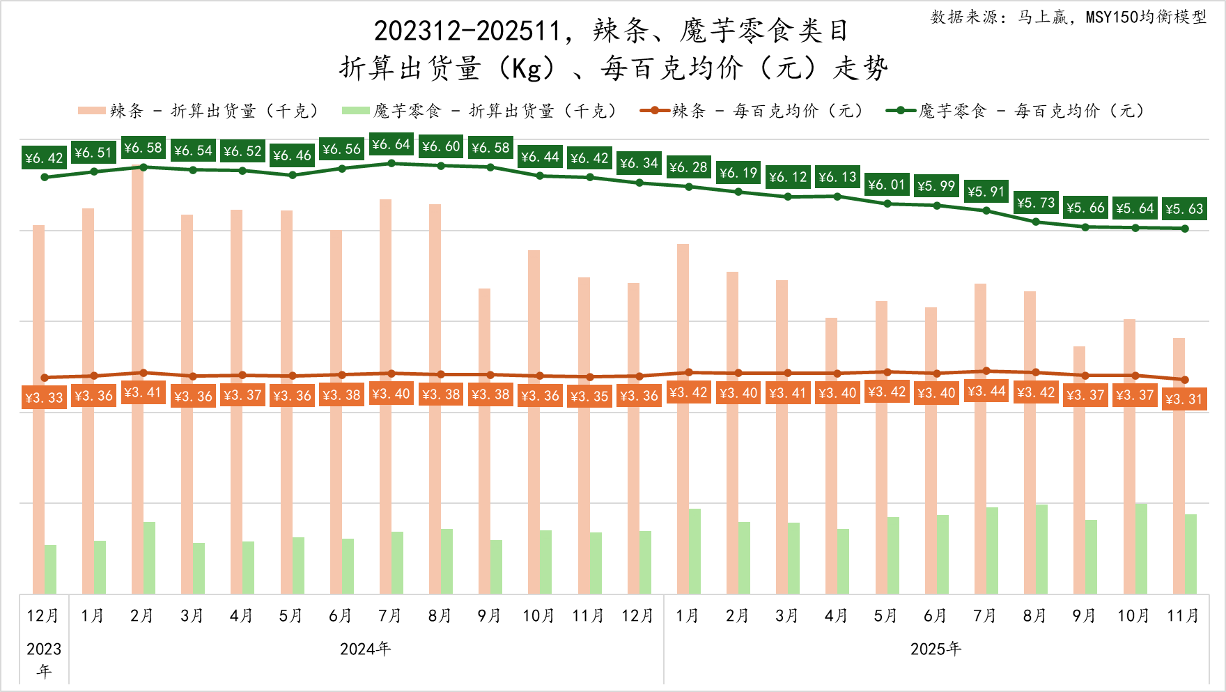 通过马上赢价格指数可以看到,休闲零食整体,以及辣条、魔芋零食类目在过去两年都有着较大的价格压力,直至2025Q3价格水平才有所回升,价格压力有所缓解。具体来看,辣条与休闲零食整体的走势相近,部分时间段的表现要好于休闲零食整体;魔芋零食同样与休闲零食整体的走势相近,但不同点在于大多数时间的表现都要弱于休闲零食整体,亦弱于辣条的表现,或可说明相较于辣条传统、稳定的市场,魔芋零食的市场格局还未完全成型,大家还在激烈的通过促销、价格战等手段抢占市场份额的过程当中,因此其波动更大、下探也更深。
