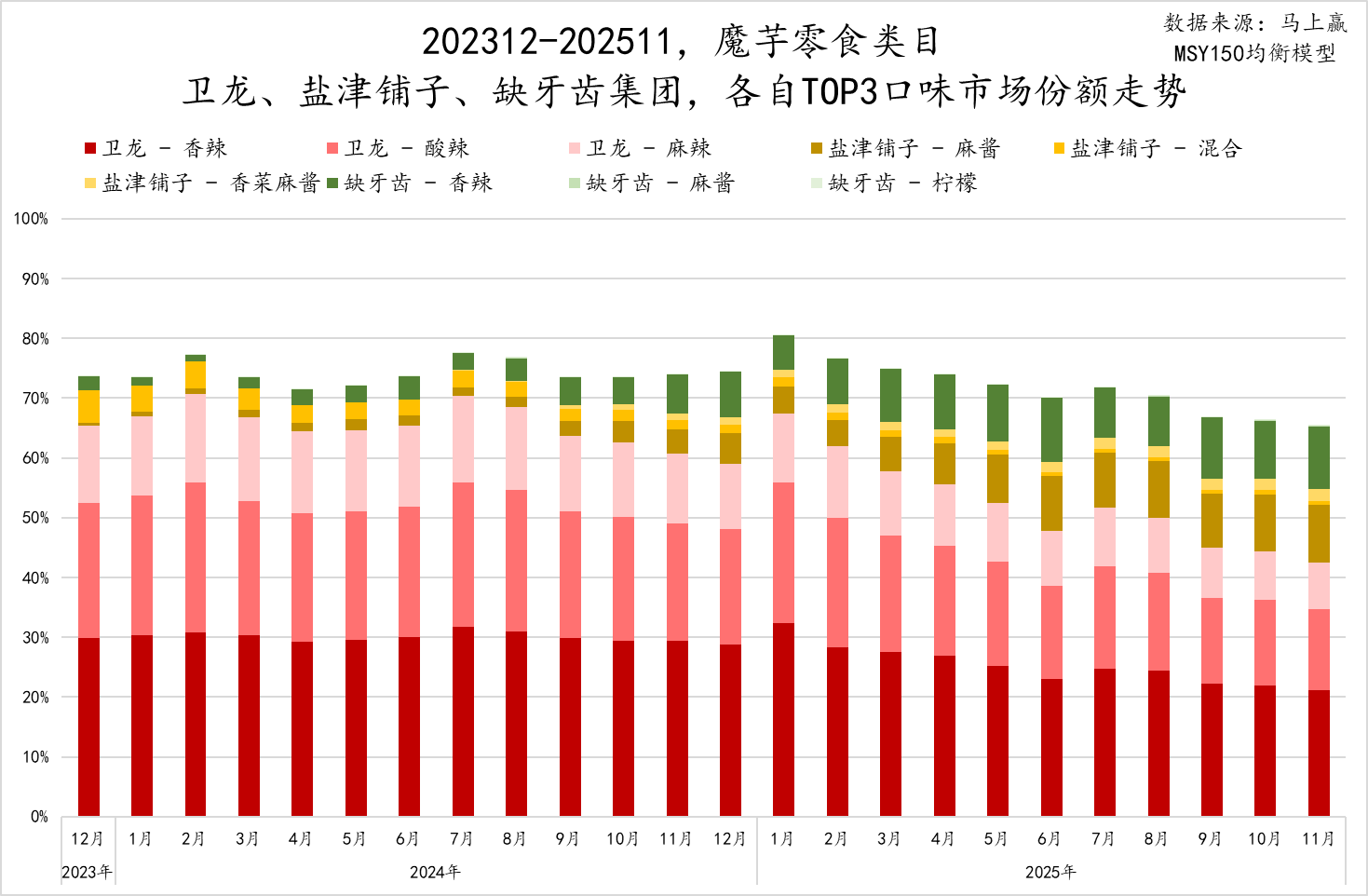 2、竞争格局:卫龙、盐津攻守都不易,缺牙齿坚守“重辣”