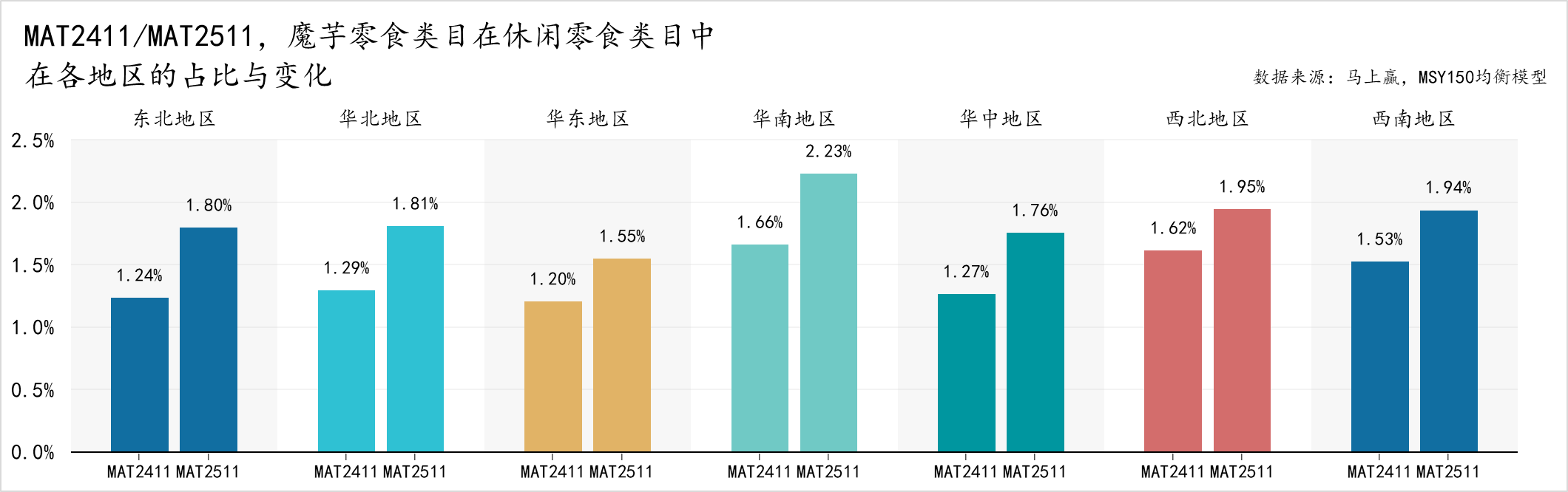 从魔芋零食类目在各地区在休闲零食大类中的占比来看,MAT2411到MAT2511,七大地区魔芋零食在休闲零食类目的占比均有显著提升。其中,华南地区在MAT2511的占比已超过2%,是魔芋零食类目在所有地区中占比最高的地区,其MAT2511相比MAT2411的占比增长也最高,西北、西南地区次之,占比均超1.9%。相较而言,华东地区占比相对较低,MAT2511仅为1.55%,其占比同比增长也相对较低。