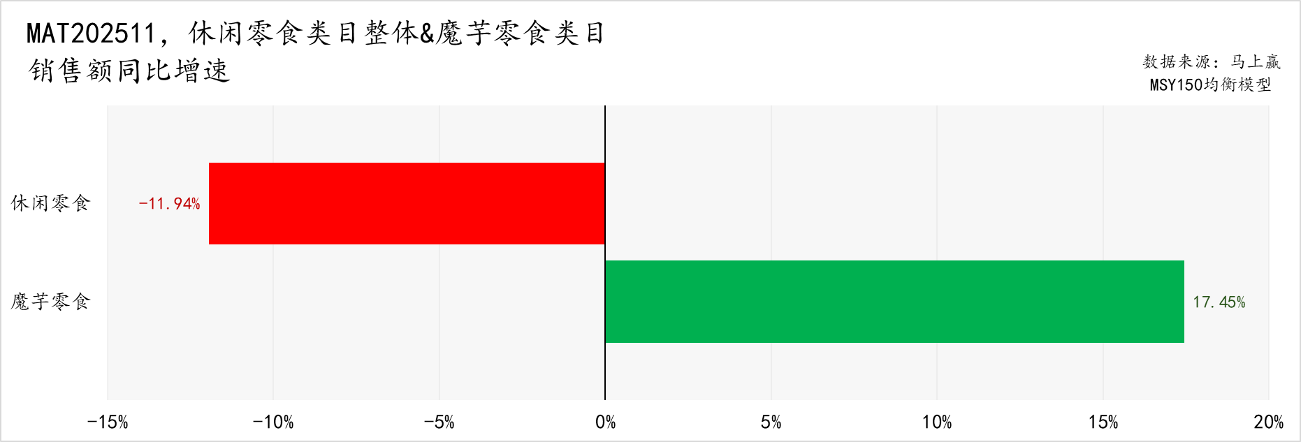 但魔芋零食却是其中的一枝独秀,从过去一年,2024年12月-2025年11月(下称MAT202511或MAT2511)休闲零食类目整体和魔芋零食类目的销售额同比增速表现来看,MAT202511休闲零食整体销售额同比增速为-11.94%,而魔芋零食类目同期的销售额同比增速不仅逆势增长,增速还高达17.45%,魔芋零食类目也是休闲零食所有三级类目中,销售额同比增速最高的类目。