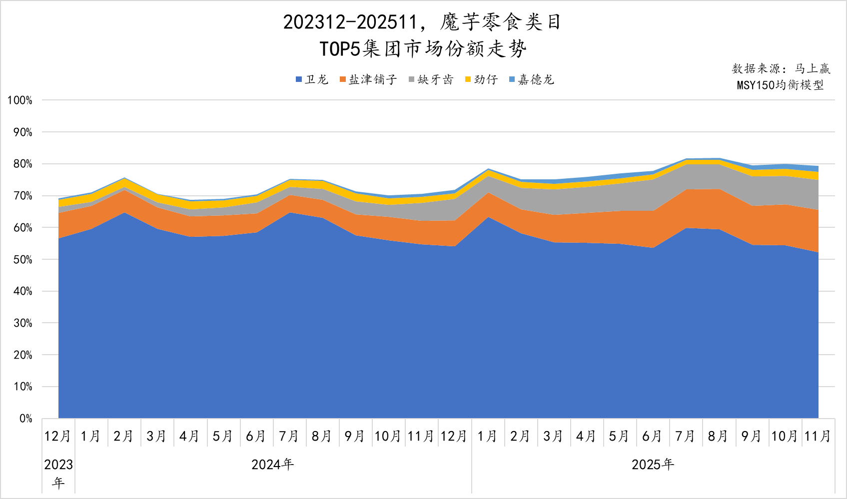 聚焦到TOP5集团过去两年的市场份额走势,这种走势上的变化更为明显,其中卫龙整体呈现着缓慢下行的趋势,盐津铺子、缺牙齿则都呈现出较为显著的上涨,排名第四、第五的劲仔、嘉德龙,整体变化不大,略有波动。