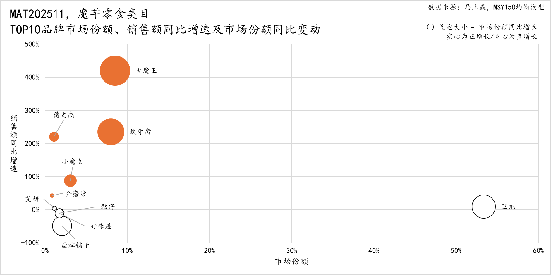 卫龙+小魔女、盐津铺子+大魔王,两者之间的品牌策略与方向,以及对于类目子品牌战略执行的坚定程度有着较大的区别,这一品牌战略与策略上的不同,也很有可能对于未来魔芋零食市场的品牌格局,带来不一样的结果和新变化。2026年,魔芋零食或许依然将处于高速增长的通道当中,两个集团的后续走向与策略上的变化,马上赢情报站也将持续关注。