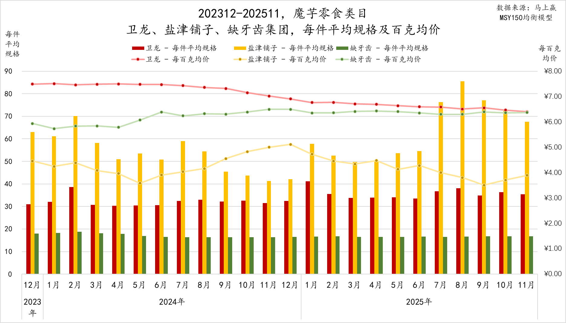 卫龙的每百克均价最高,前期超过7元/每百克,是盐津铺子近一倍的每百克均价,但随着盐津铺子麻酱系列产品铺市并受到追捧,市场竞争逐渐加剧,卫龙的每百克均价从2024年9月开始下降,直至2025年11月依然还在下降通道当中。除了市场竞争加剧,造成两者每百克均价差距大的另一个原因或许是卫龙的件平均规格较小,通常意义上,规格越小的产品,其每重量价格就会越高。