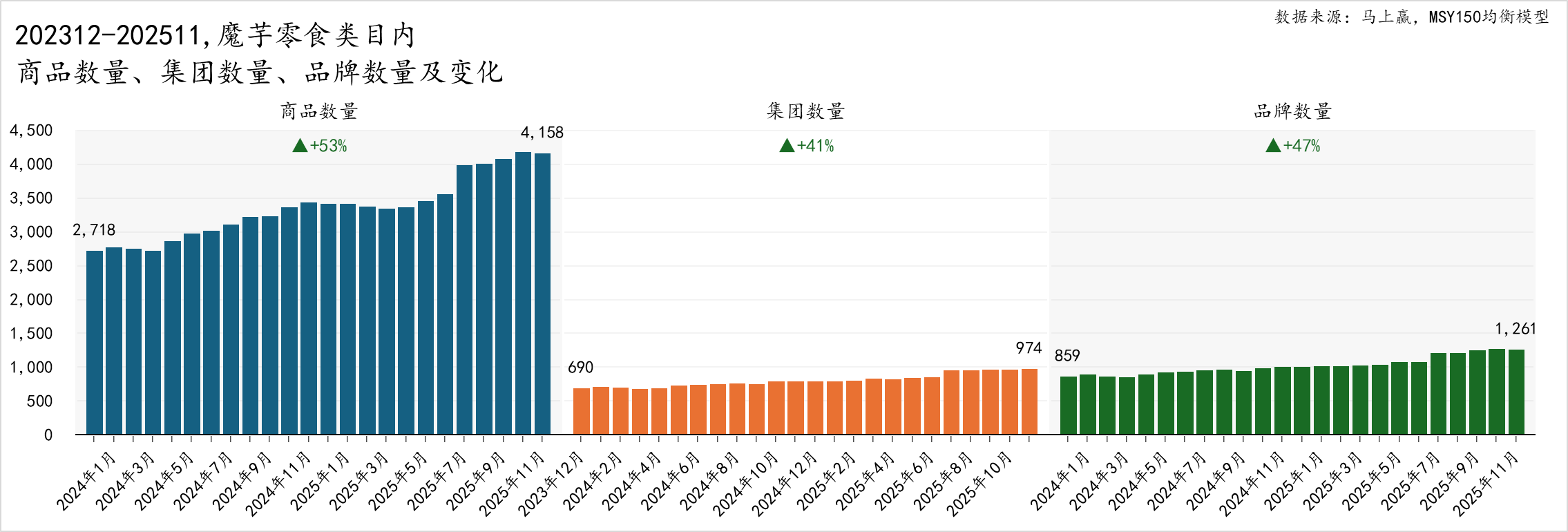 从供给变化上,我们从类目内商品数量、参与集团数量与参与品牌数量三个角度来看,三个角度的共同点是从观察期内的首期-2023年12月,到尾期-2025年11月,都有着50%左右的增长。其中商品数量从2023年12月的2718个SKU上升至25年11月的4158个SKU,增幅高达53%;参与集团数量则从690家增长至974家,增幅高达41%;参与品牌数量从859家增长至1261家,增幅达到47%。