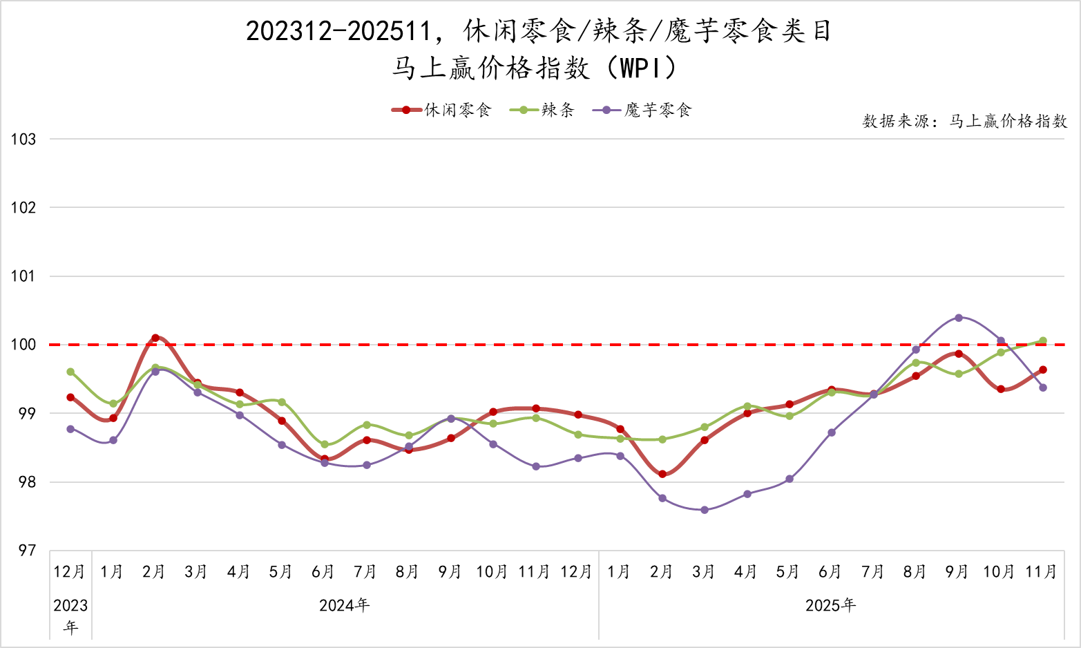 为了更好的观察类目的价格水平变化,我们拉取了休闲零食类目,以及辣条、魔芋零食两个类目的马上赢价格指数(WPI),指数以100为基准值,其数值上下波动为类目的价格指数与去年同期价格指数的相对百分比,100表示与去年同月持平,高于100表示同比价格水平上升,低于100则表示同比价格水平下降。