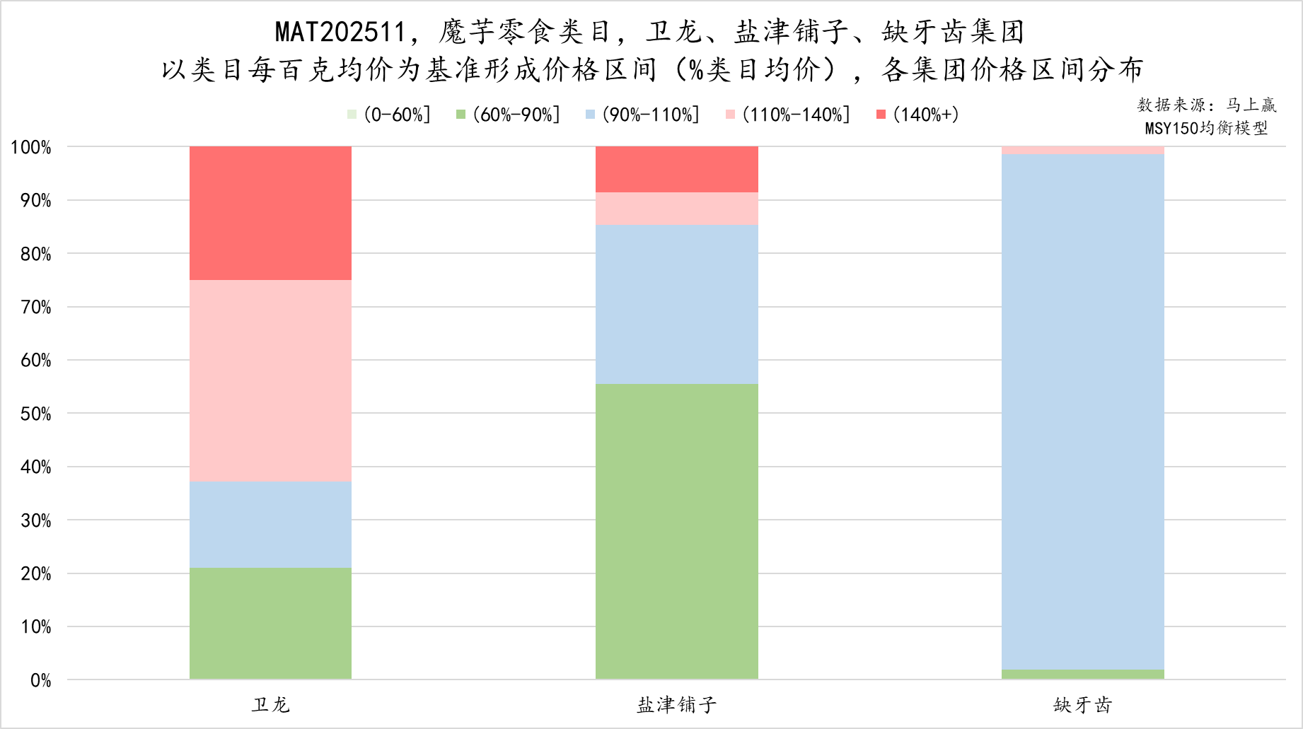 从三家的销售额/每百克均价价格带分布上,也能看到三者的不同策略与布局。我们以MAT202511,魔芋零食类目的类目平均每百克均价=100%,向上向下各划分两个区间,共形成均价的0%-60%、60%-90%、90%-110%、110%-140%、140%+五个区间,区间均为左开右闭,通过将三个集团不同产品不同每百克均价的销售额落位到上述区间中,去看三者在类目每百克均价价格区间上的销售额构成与占比。