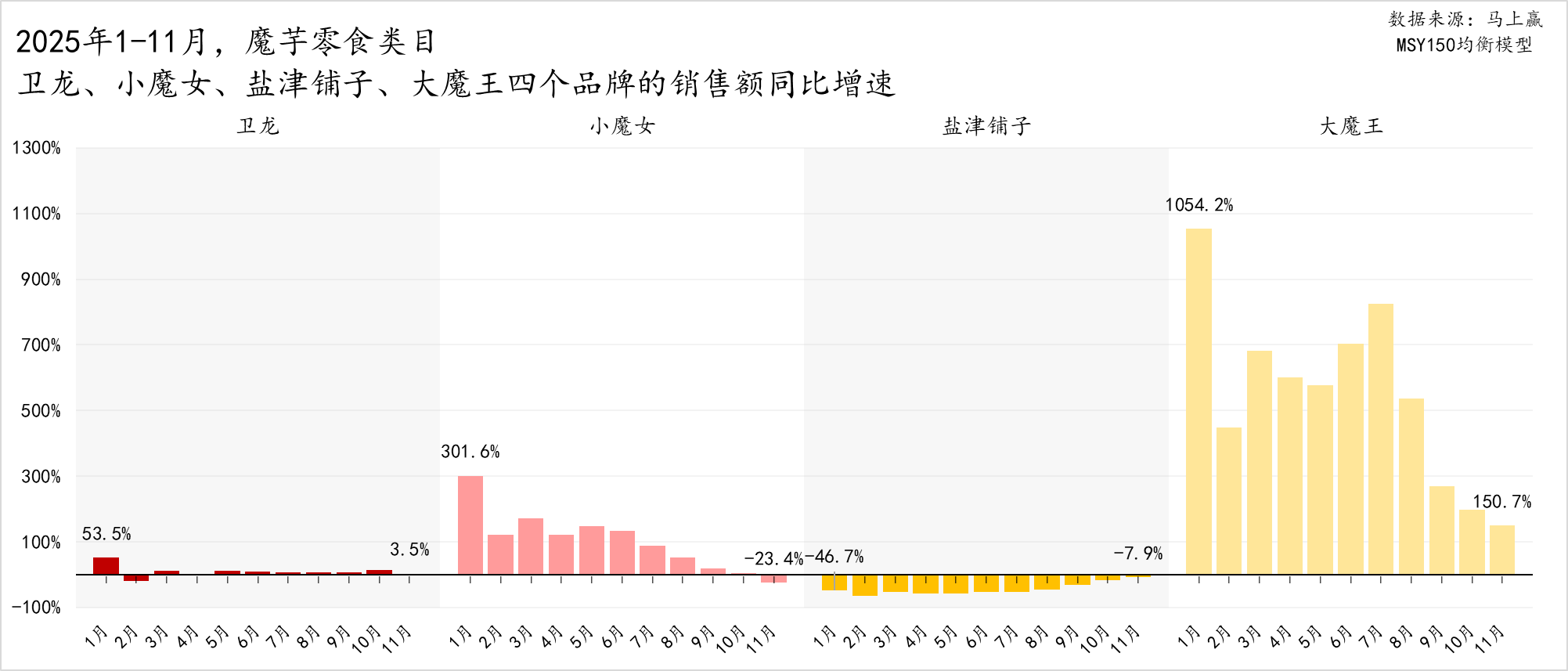 而盐津铺子与大魔王,其集团品牌盐津铺子,在全年内销售额同比增速均为负,出清明显,与此同时大魔王子品牌却始终保持高增长,全年最低的销售额同比增速也超过了150%,最高的1月受春节错位的影响,同比增速一度超过1000%。