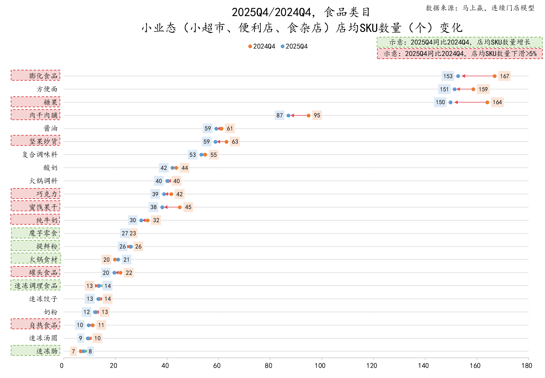 在下面的组图中,类目文字上有绿色虚线方框意为该类目在该业态类型中的店均SKU数量同比有所增长,没有背景色块的、红色虚线方框的类目则是店均SKU数量同比有所减少,其中红色虚线方框为2025Q4同比2024Q4,店均SKU数量同比下降超过5%的类目,敬请知悉。