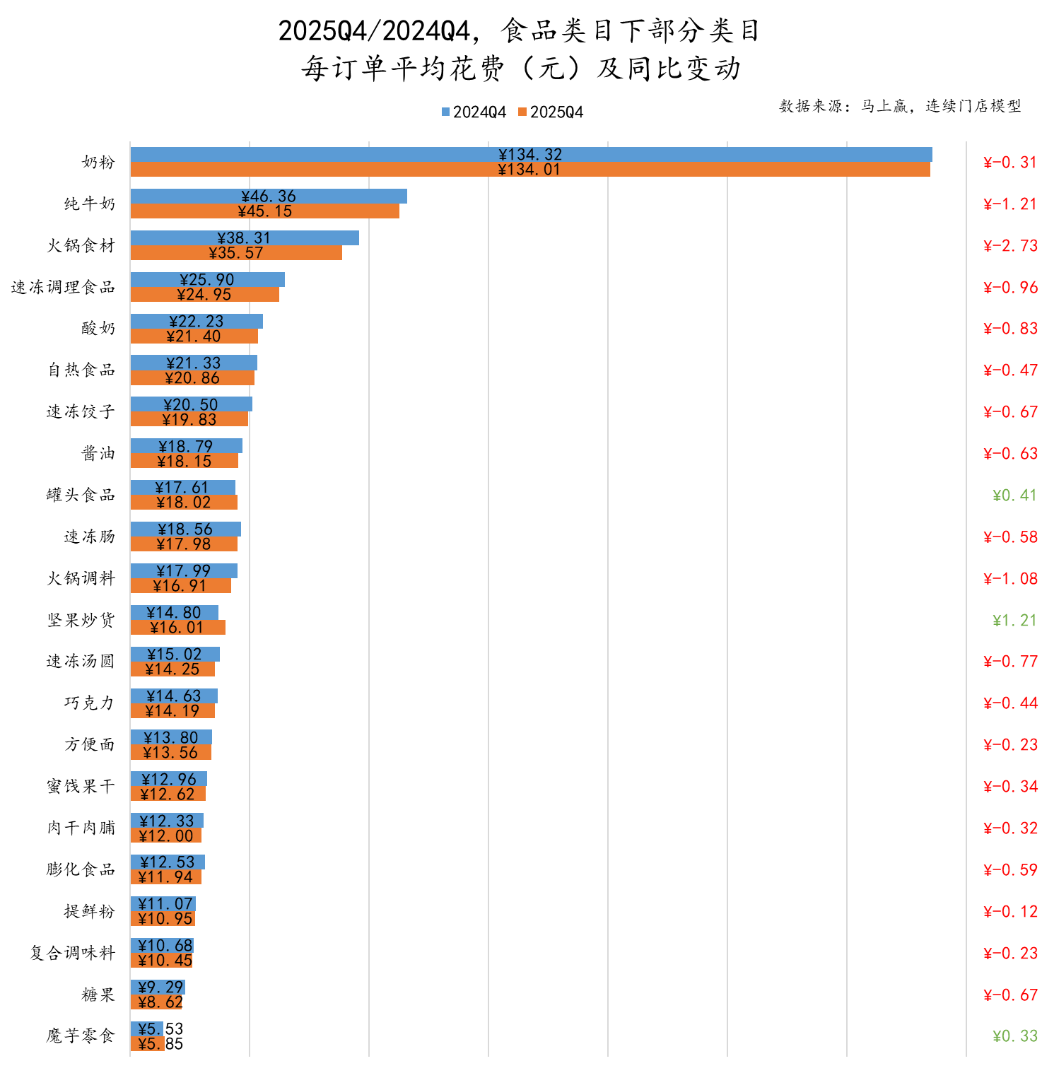 在2025Q4,食品类类目每订单平均购买件数变动上,仅有速冻肠类目有着极小幅度的同比增长,这也与类目本身的快速成长相关。