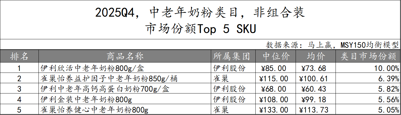 在非组合装产品中,TOP 5 SKU归属伊利股份和雀巢集团。伊利股份共有三款产品上榜,市场份额合计超20%,规格主要为700g或800g,但价格从68元-108元不等,涵盖不同功效和市场定位;雀巢集团也有两款产品位列第二和第五,其中”怡养健心中老年奶粉“主打高端路线,中位价达到133元,为TOP 5 SKU中中位价、均价最高的产品。