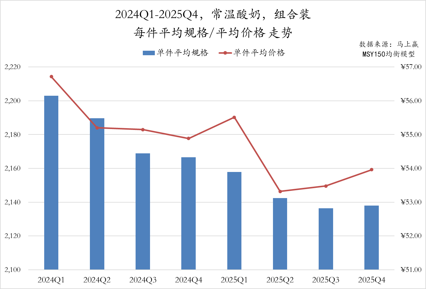 组合装方面,常温酸奶组合装产品件均规格也呈现持续缩减态势,从2024Q1的约2200ml/pcs连续下滑至2025Q3的2130ml/pcs,相比2024年同期仍有较大差距。件均价走势与件均规格大致相同,由2024Q1最高的56.7元/pcs波动下降,虽然2025Q1受节庆影响显著回升至55.5元/pcs,但此后又有所下滑。