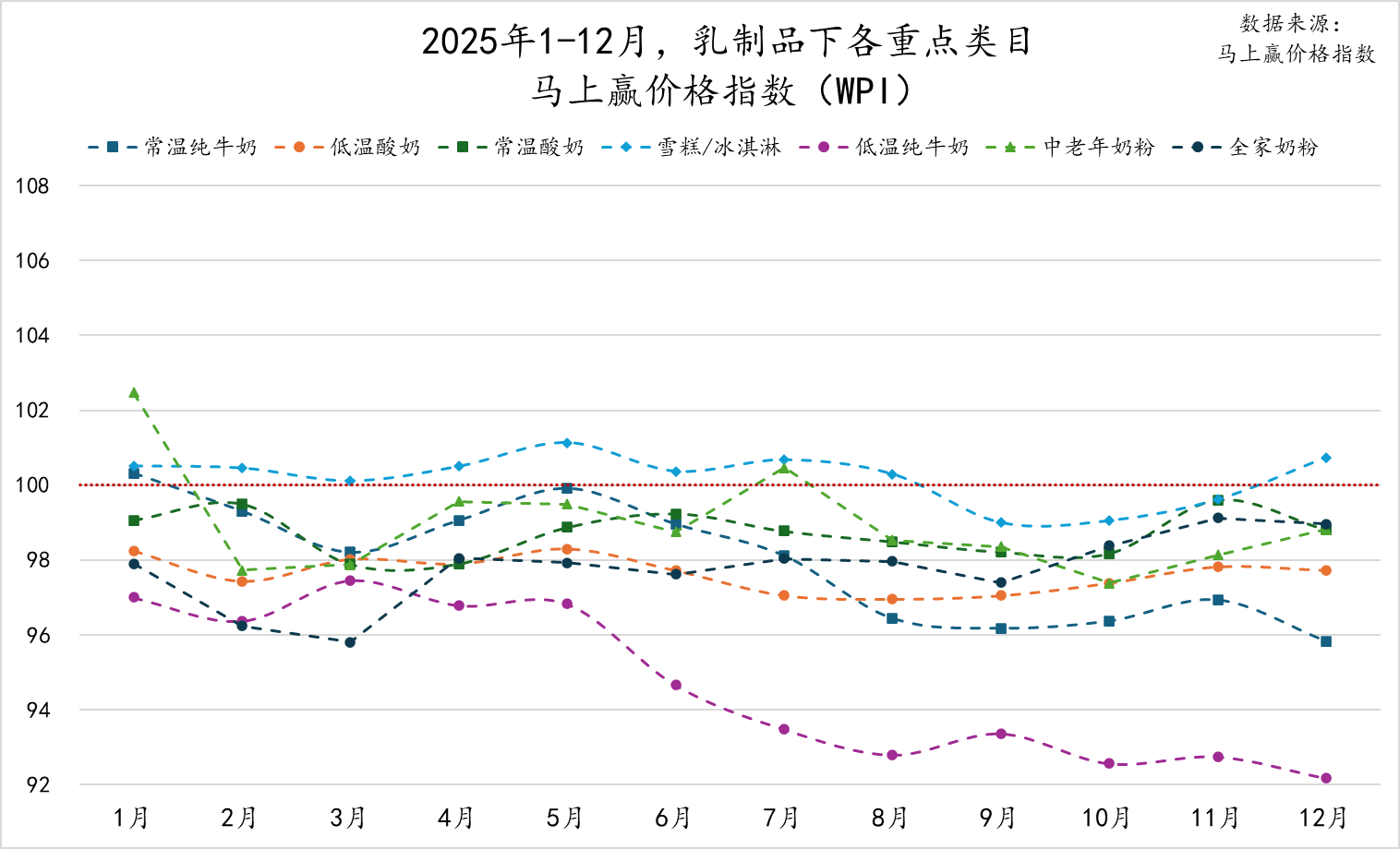 为了更好地分析乳制品类目整体价格持续变动和走势,我们拉取了乳制品整体及其各重点类目,202501-202512的马上赢价格指数WPI(详细介绍参见:新产品丨马上赢价格指数(WPI)发布啦!)。该指标以100为基准值,其数值上下波动为类目的价格指数与去年同期价格指数的相对百分比,100表示与去年同月持平,高于100表示同比价格指数上升,低于100则表示同比价格下降。