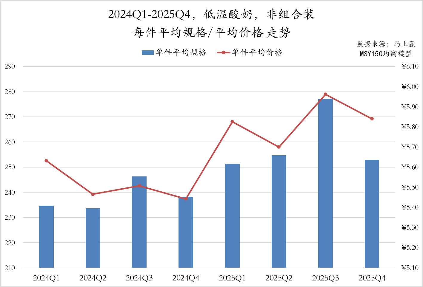 2024Q1至2025Q4,低温酸奶非组合装产品的件均规格与件均价整体呈现出波动上行后高位回调的走势。件均规格自2024Q2起波动上升,2025Q3达到最高点;件均价格走势与规格基本同步,2025Q1受春节消费拉动价格大幅攀升,虽在Q2略有回调但Q3再次拉升。总体来看,2025年前三季度规格持续走高,价格也波动提升,尽管2025Q4出现双降,但较2024年同期水平均明显提高,类目产品升级、提价或在持续进行中。