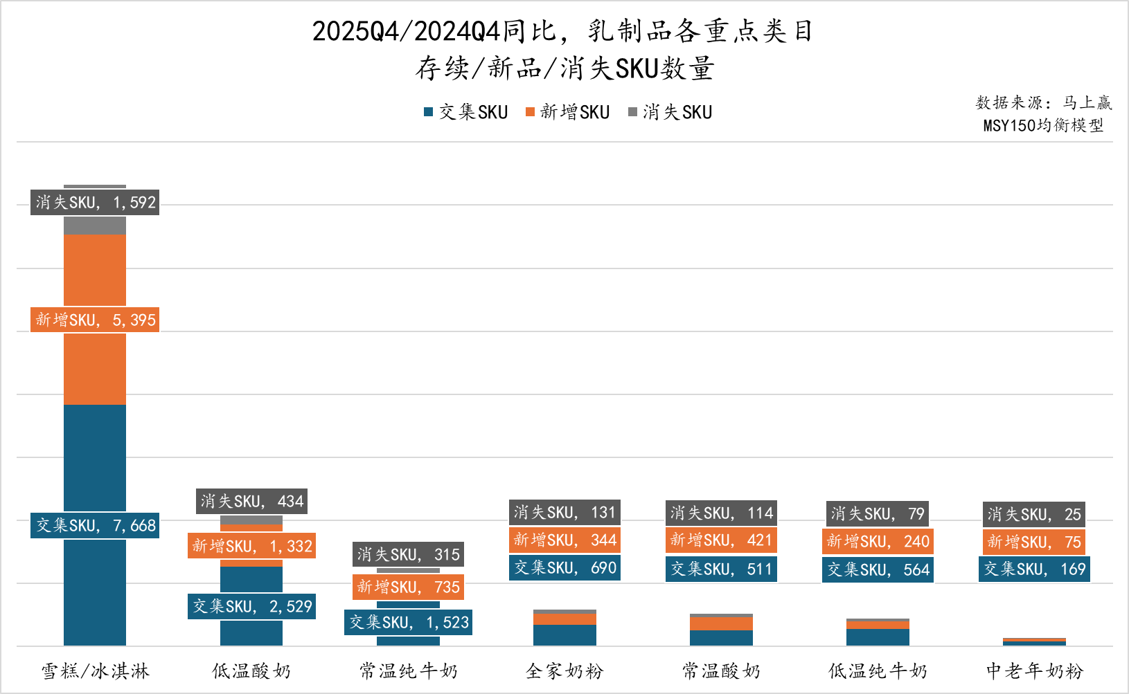 从2025Q4/2024Q4同比情况看,雪糕/冰淇淋仍是SKU规模最大的类目,交集SKU达7668款,新品SKU高达5395款,显著高于消失SKU的1,592款,该类目在保有高SKU存量的同时,产品更新与上新依然活跃;低温酸奶SKU总体体量位居第二,交集SKU为2529款,新品SKU数量明显高于消失SKU,延续了较快的上新节奏;常温纯牛奶类目虽然在乳制品大类中占比显著高于其他所有类目,但其SKU规模并不算大,新增SKU、消失SKU数量也均不算太多。全家奶粉、常温酸奶及低温纯牛奶SKU规模虽然有限,但新品SKU也都高于消失SKU数量;中老年奶粉SKU总量最小,但亦实现一定程度的新品补充与新陈代谢。