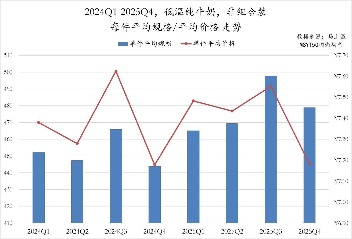 从2024Q1至2025Q4常温纯牛奶非组合装产品来看,件均规格整体呈现“先抬升、后回落、再小幅修复”的变化态势。2024 年内规格总体稳中有升,进入2025年后出现明显收缩,随后虽然在 2025Q3–2025Q4小幅回升,但整体仍低于2024年水平。