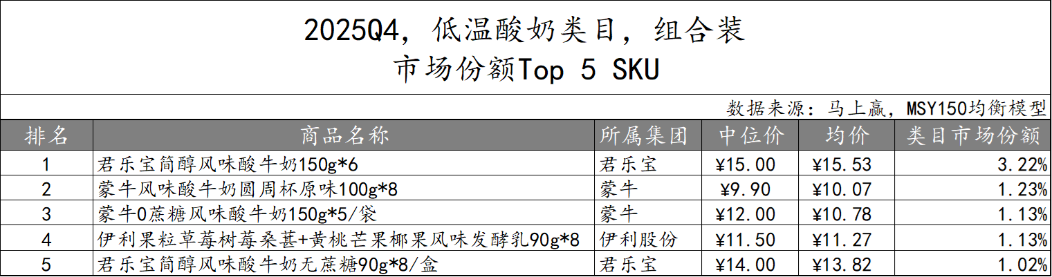 低温酸奶非组合装产品2025Q4市场份额TOP 5 SKU由伊利股份和君乐宝集团占据。伊利股份两款规格相同但风味不同的产品位居前二。君乐宝集团则主打“0添加”、“零蔗糖”概念,共有三款产品上榜。具体来看,低温酸奶非组合装TOP5产品风味多样,规格在120g-420g不等,产品类型、场景的多样性较为丰富。
