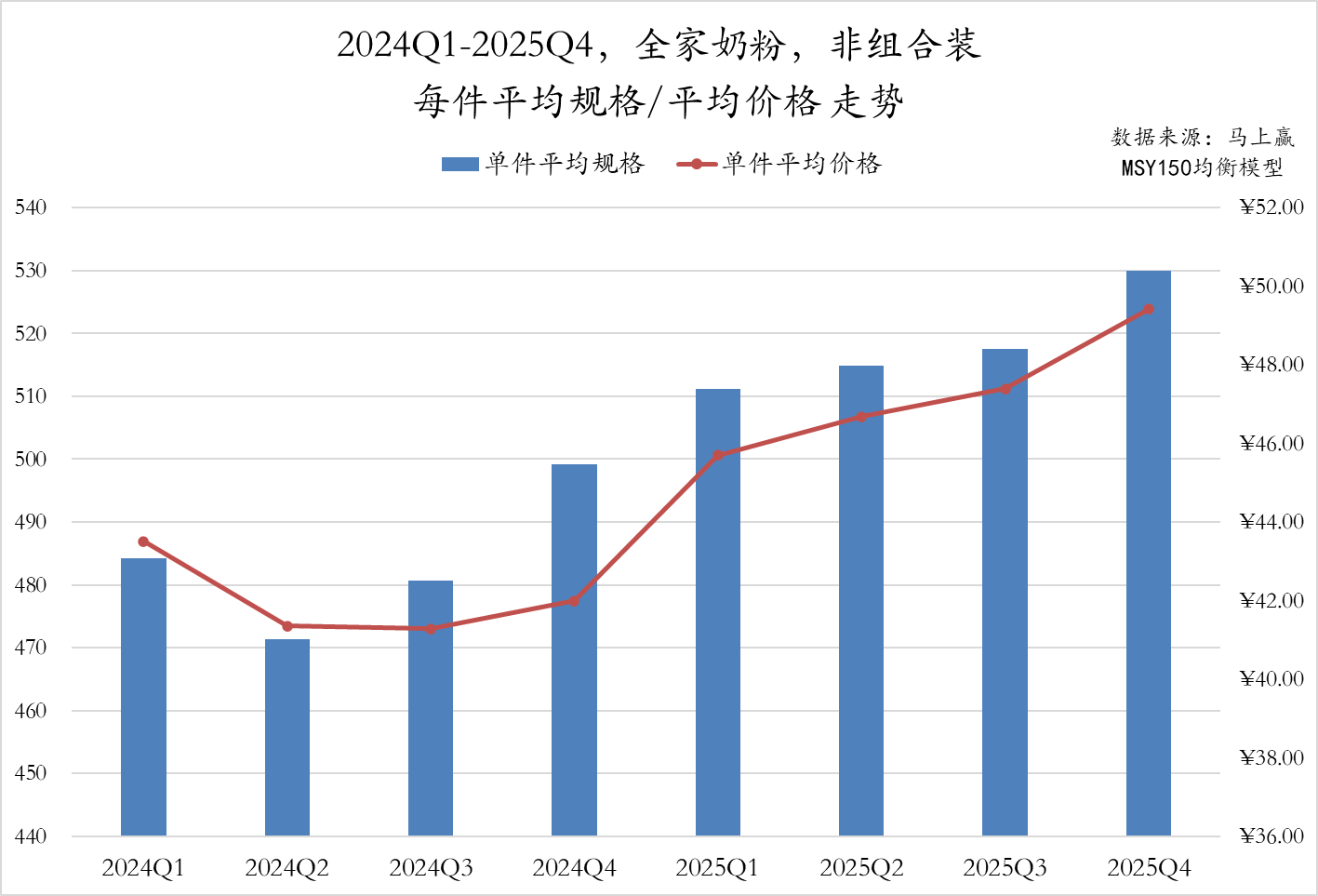 从2024Q1至2025Q4中老年奶粉非组合装产品来看,2024、2025Q1各自有一个件均规格、件均价格的高点,或与春节礼赠相关的消费有较强的相关性。从2025同比2024年的情况来看,件均价同比均有轻微上升,规格在2025Q1同比2024Q1有明显上升,其余时间有轻微上升。