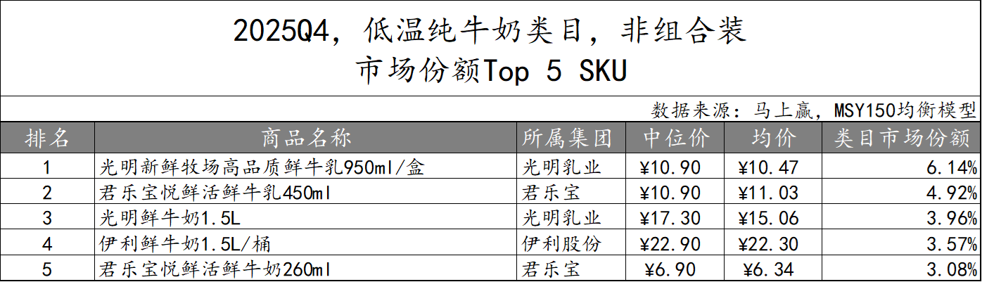 2025Q4,低温纯牛奶CR5集团依旧由君乐宝、伊利股份、蒙牛、光明乳业和新乳业组成,市场份额合计67.80%,较上一季度有所下滑,或与类目的快速增长相关。