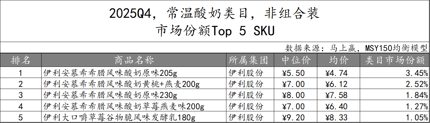 组合装产品TOP 5 SKU方面,伊利股份依旧独揽。五款头部产品均为安慕希系列,涵盖不同口味和规格,内装数量均为10个左右,五个组合装SKU的市场份额合计超过42%,显示出伊利在常温酸奶类目中的掌控力。