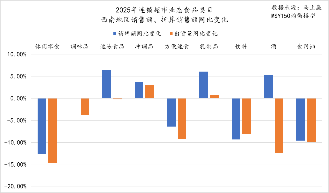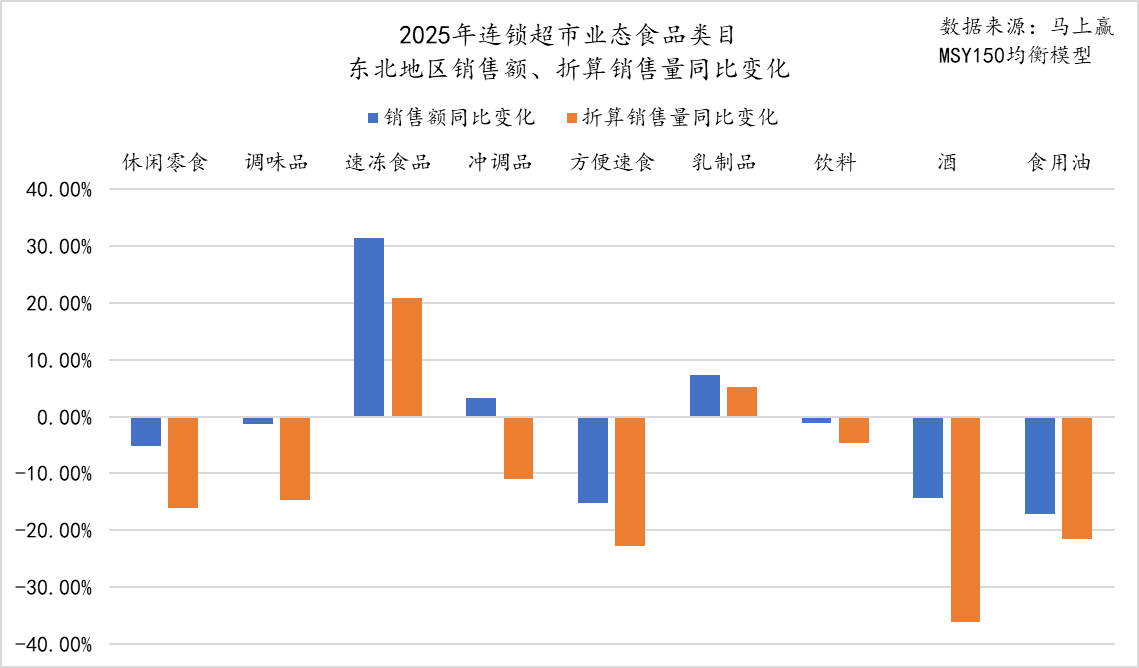 从2025年,连锁超市业态下各食品类目在各地区的发展情况看,速冻食品在大多数地区中均是最稳健的增长点,在多数区域实现全指标正增长,东北销售额增速更是突破30%;酒类与乳制品在局部市场表现亮眼,如华中地区酒类销售额增长超30%、西南地区乳制品销售额同比为正。调味品与食用油这类基础烹饪类目则表现出较好的抗跌特性。