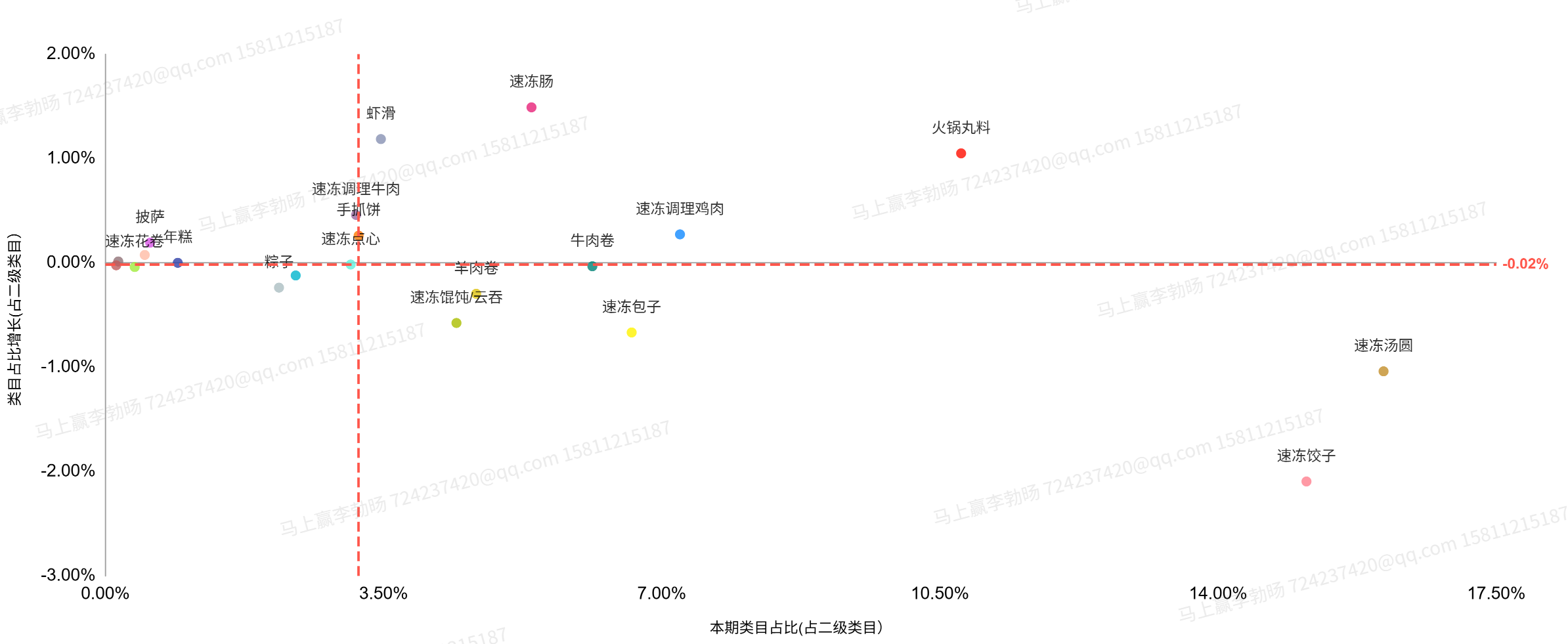 2025年全年,连锁超市业态,速冻食品类目-类目占比(横轴)及其同比增速(纵轴)