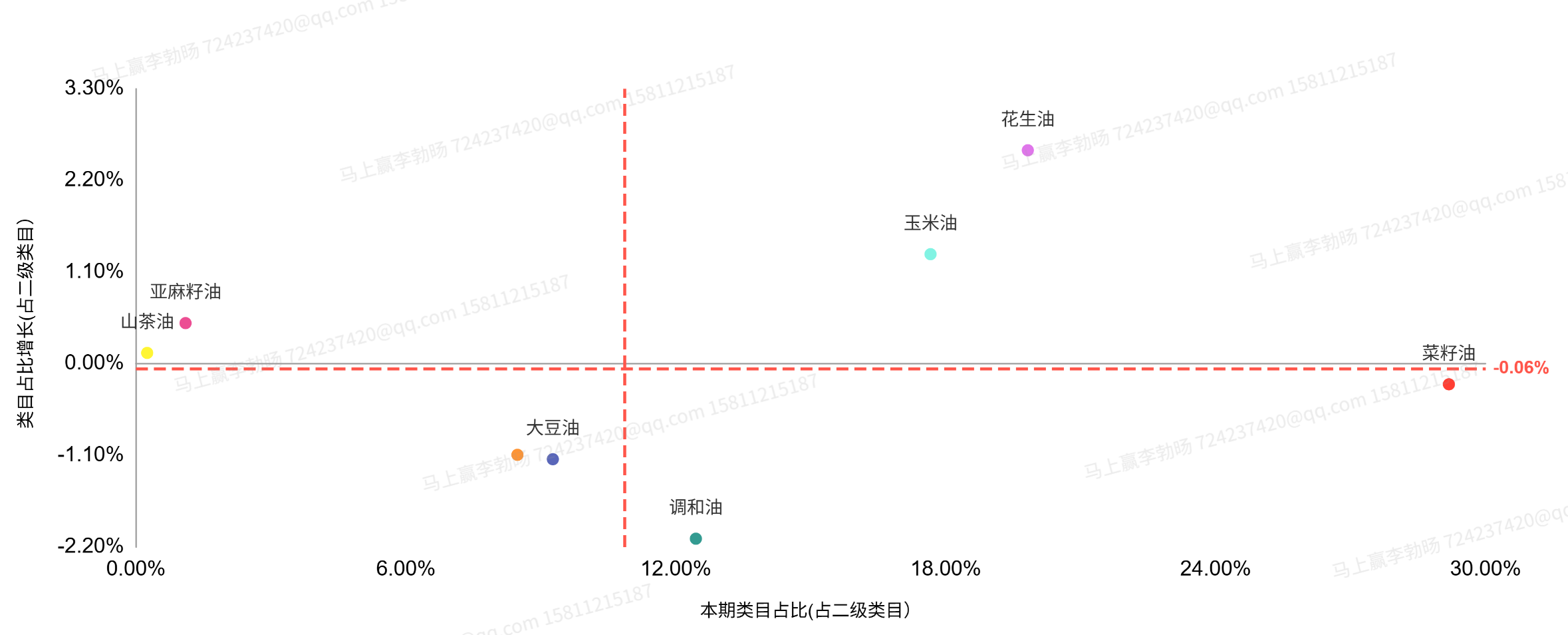 占比相对较小的亚麻籽油、山茶油的占比同比均有一定的增长,但整体规模依然相对较小。