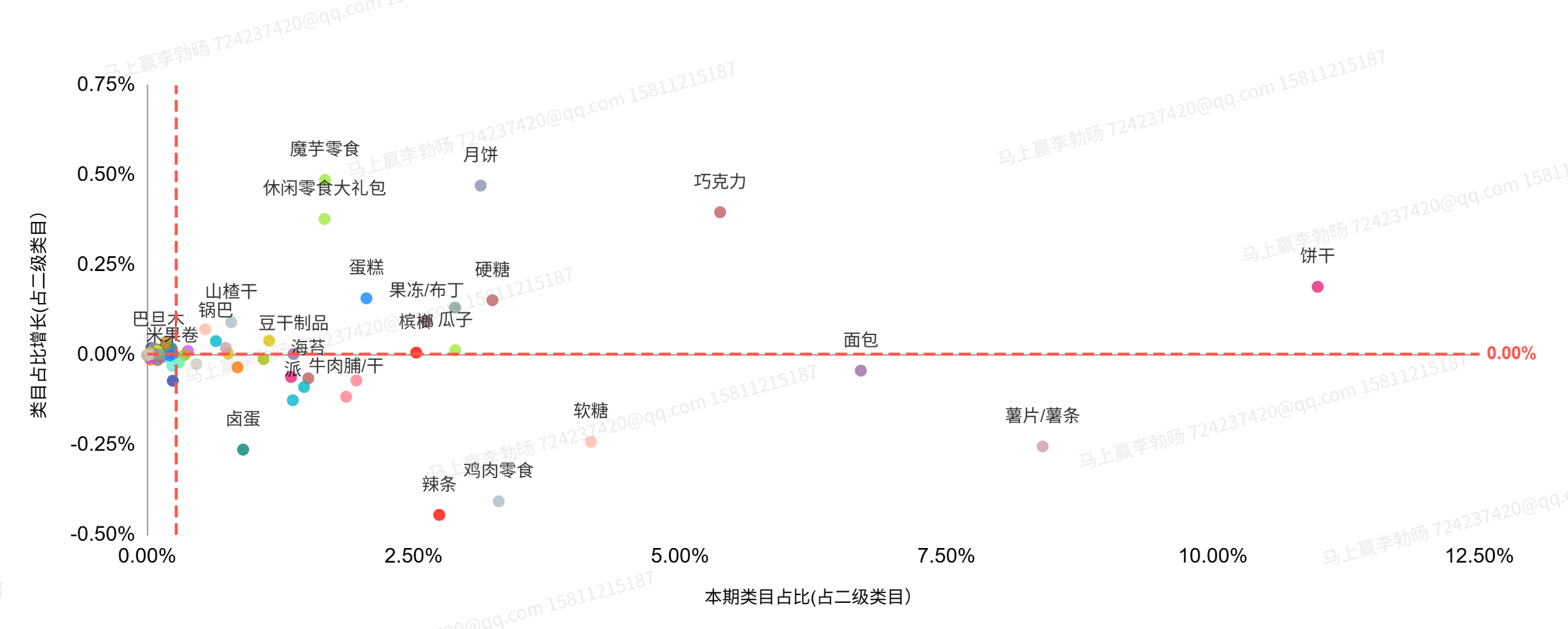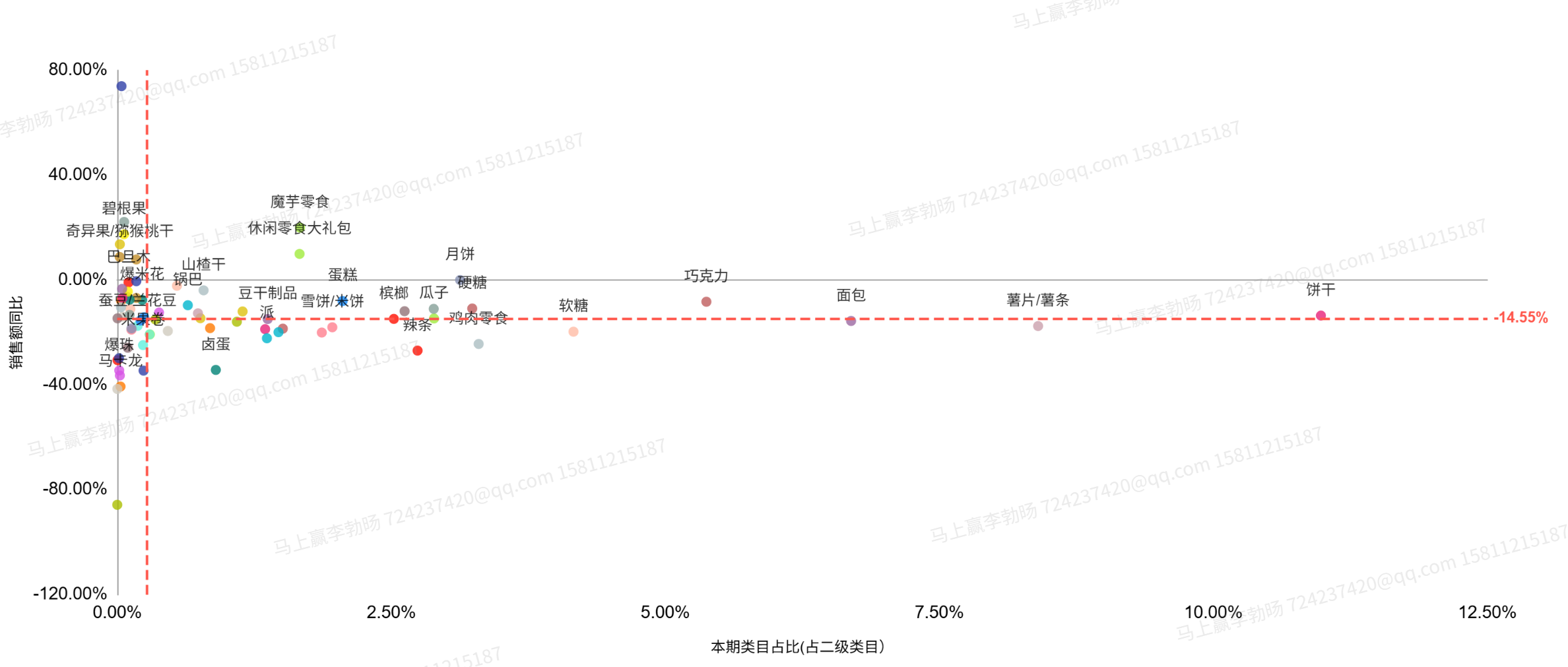 2025年全年,连锁超市业态,休闲零食类目-类目占比(横轴)及销售额同比增速(纵轴)