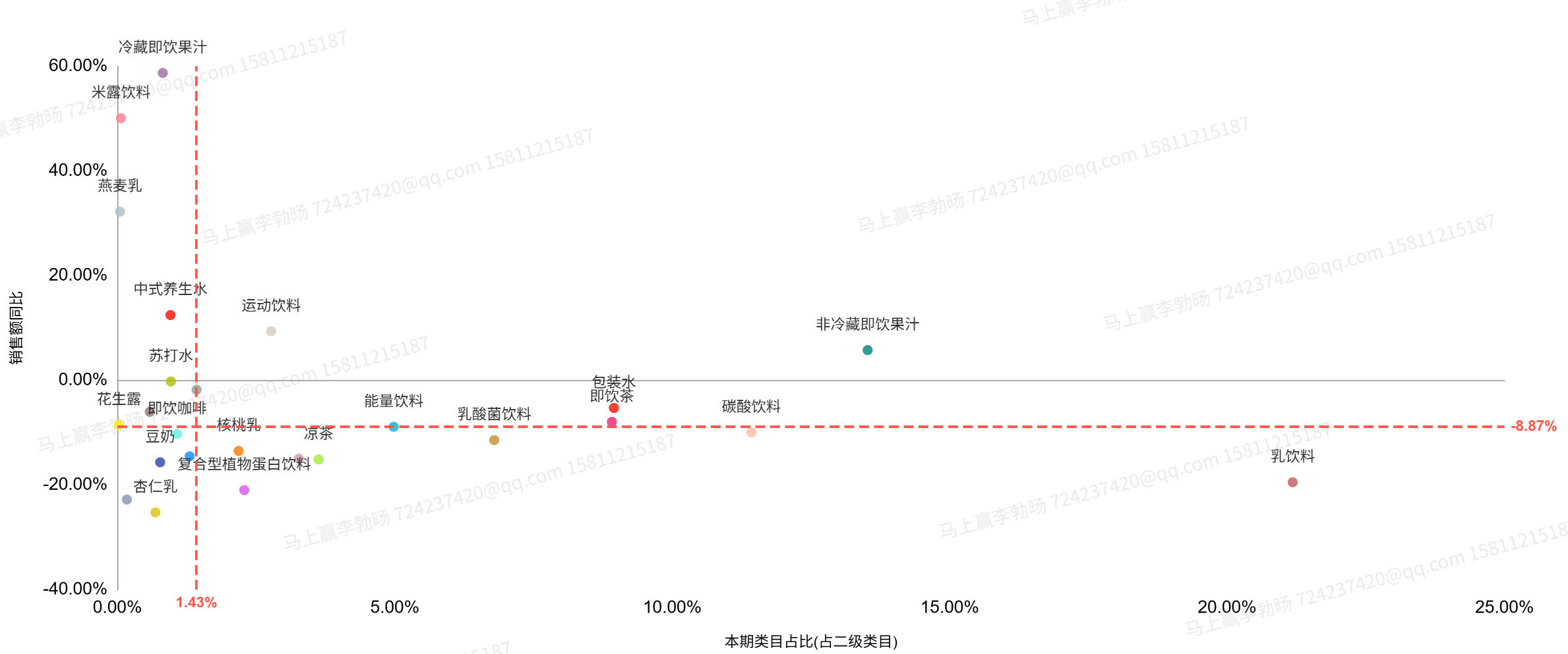 2025年全年,连锁超市业态,饮料类目-类目占比(横轴)及销售额同比增速(纵轴)