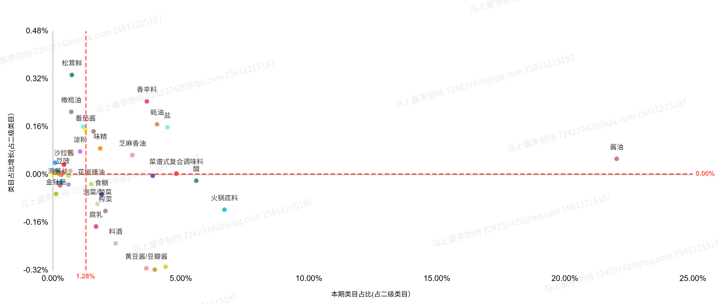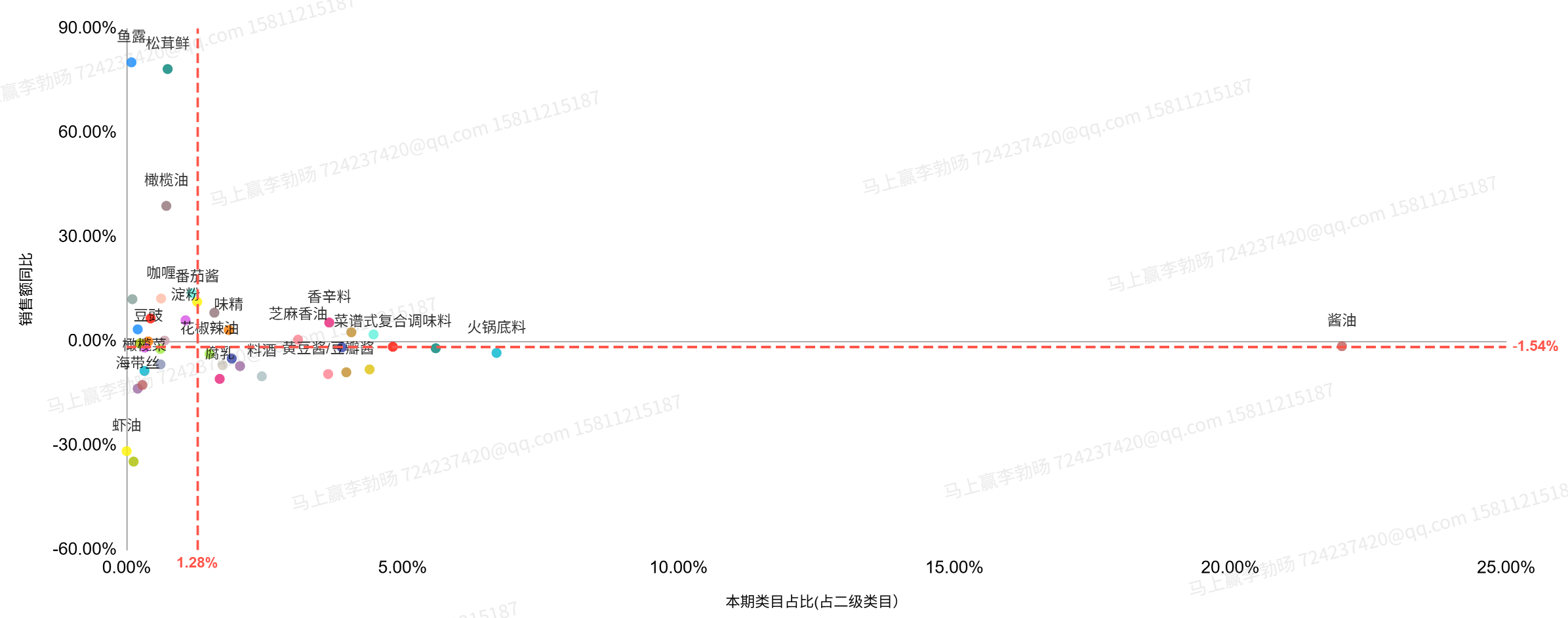 相比之下,火锅底料虽然占比近7%,但其类目占比同比为负,重要性正在减弱。黄豆酱/豆瓣酱、料酒、腐乳等类目不但占比较小,其类目占比同比也进一步下滑,重要性正在进一步减弱。