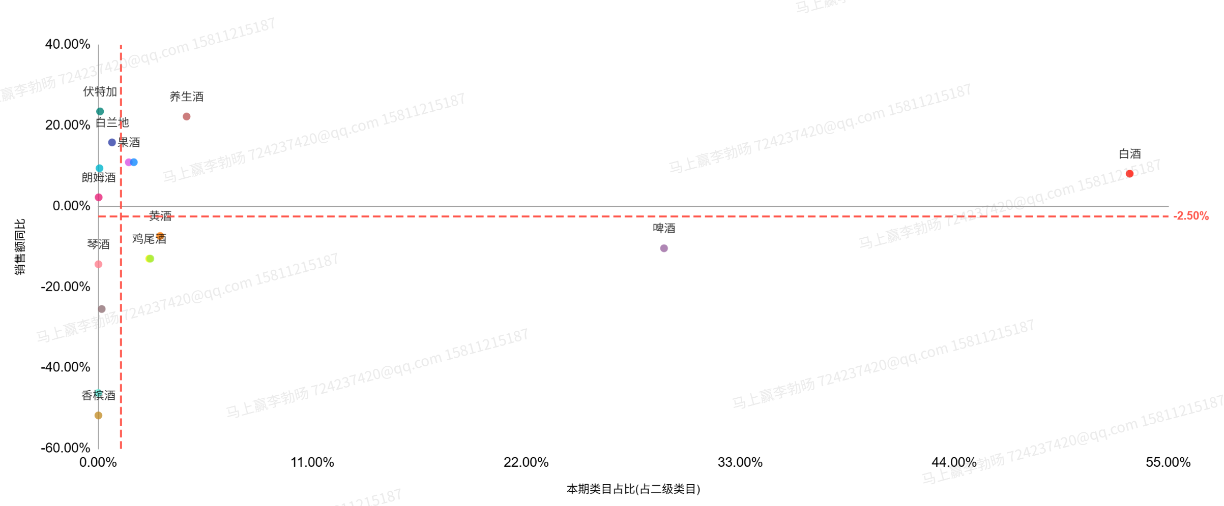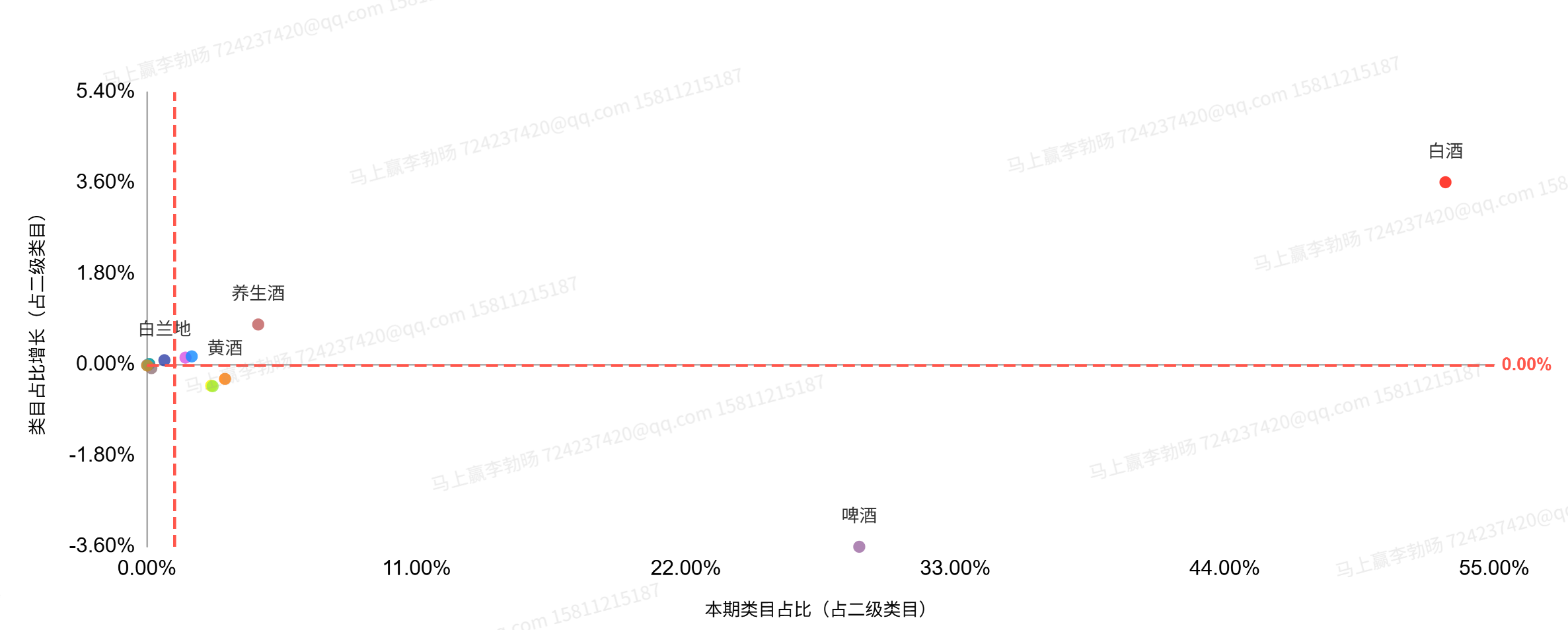 除了白酒、啤酒外,部分细分赛道展现出一定的增长潜力——养生酒虽然占比较小,但其类目占比增长较为明显。此外,黄酒与白兰地等类目表现相对平稳,其占比变化基本在基准线附近小幅度波动。