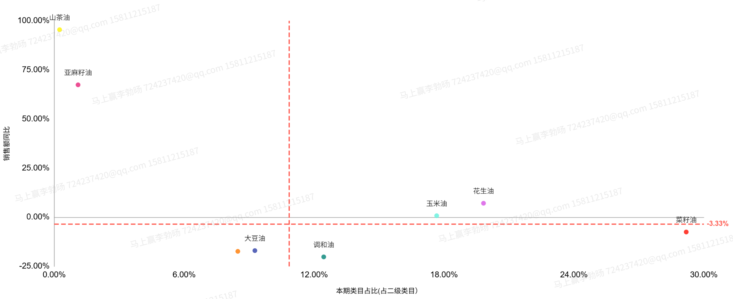 相比之下,菜籽油、调和油、大豆油等更为传统、日常的油种,销售额同比均为负。