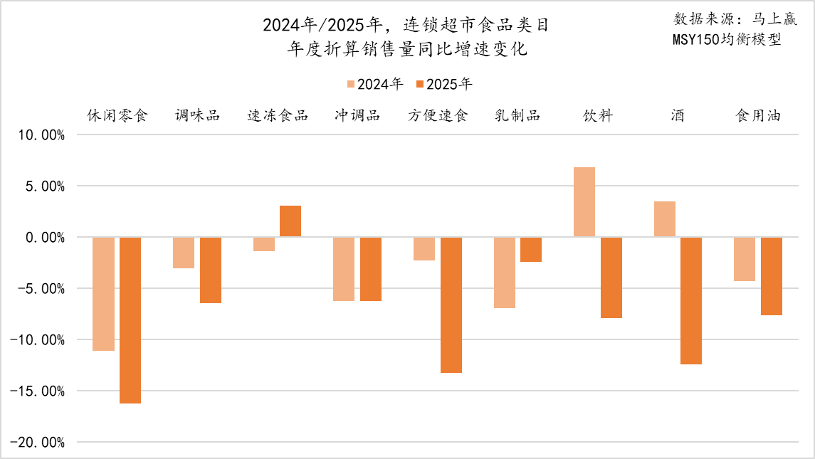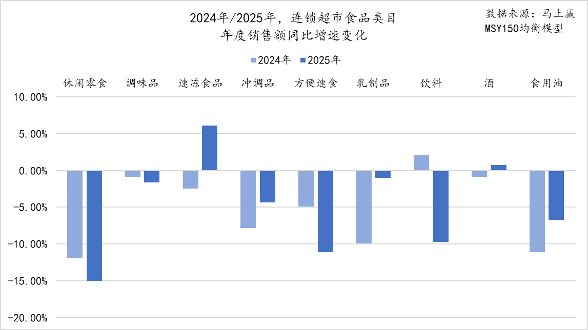 此外,食用油、冲调品和乳制品虽然销售额同比下滑幅度较2024年有所收窄,但在2025年依然为负。