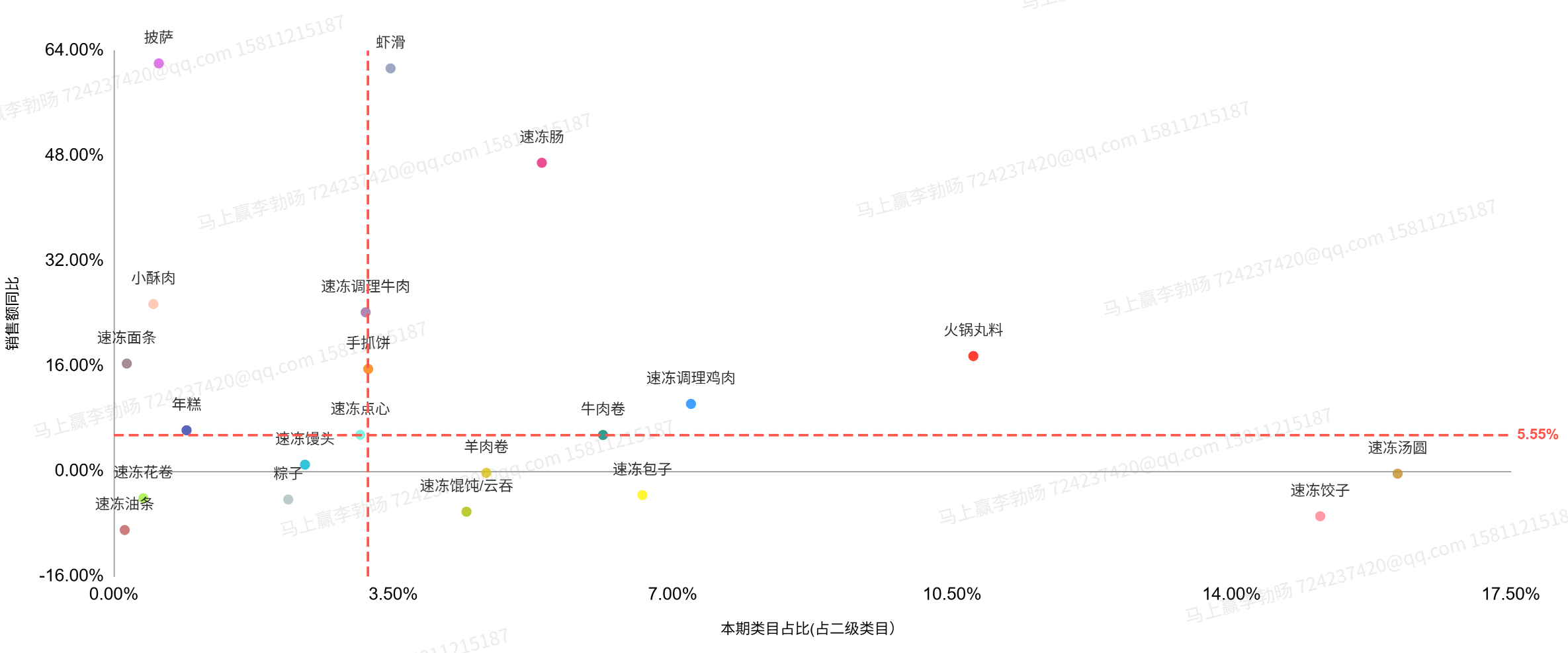 2025年全年,连锁超市业态,速冻食品类目-类目占比(横轴)及销售额同比增速(纵轴)