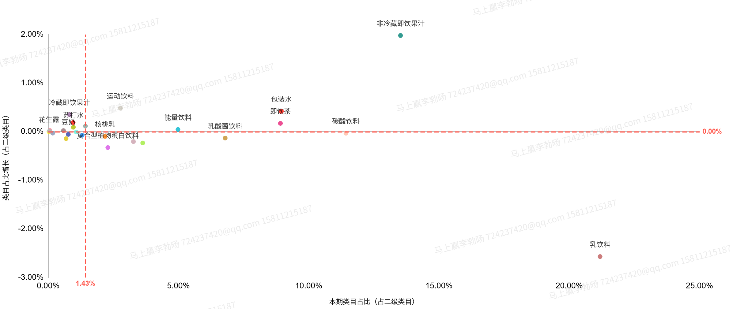 2025年全年,连锁超市业态,饮料类目-类目占比(横轴)及其同比增速(纵轴)