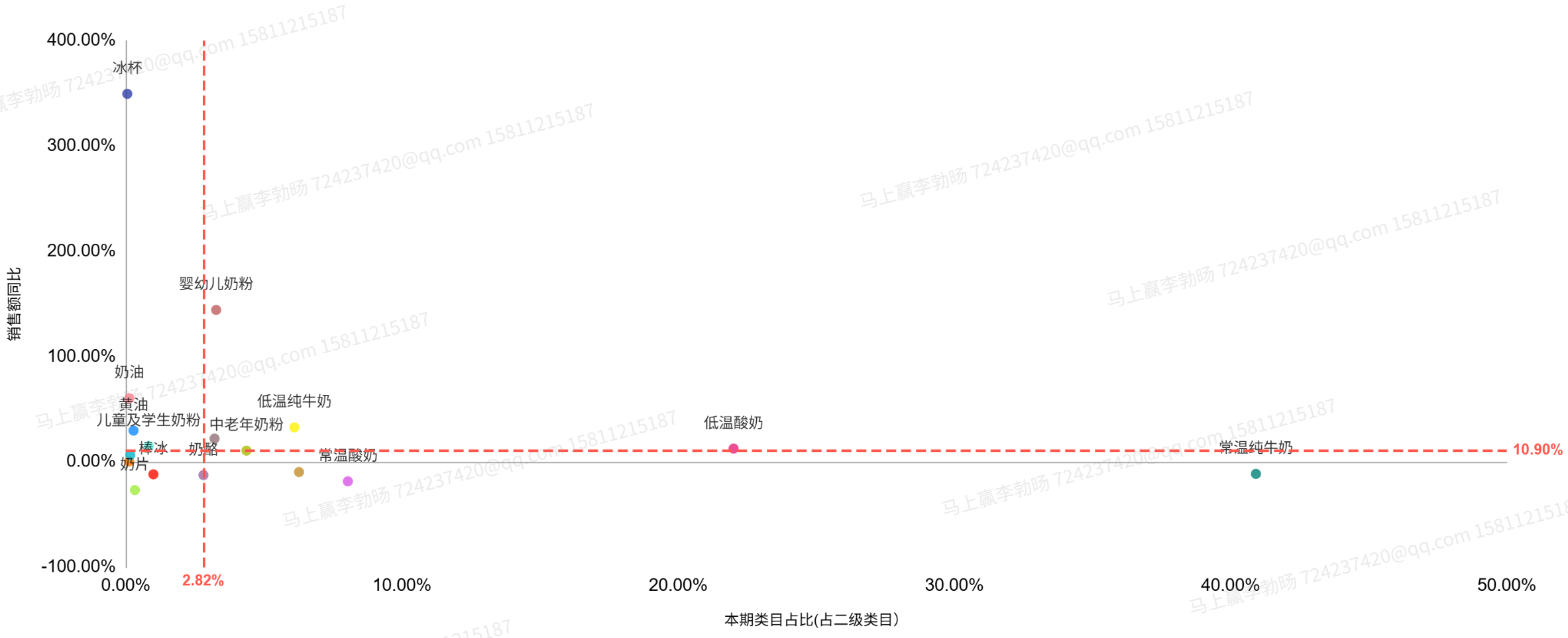 2025年全年,连锁超市业态,乳制品类目-类目占比(横轴)及销售额同比增速(纵轴)