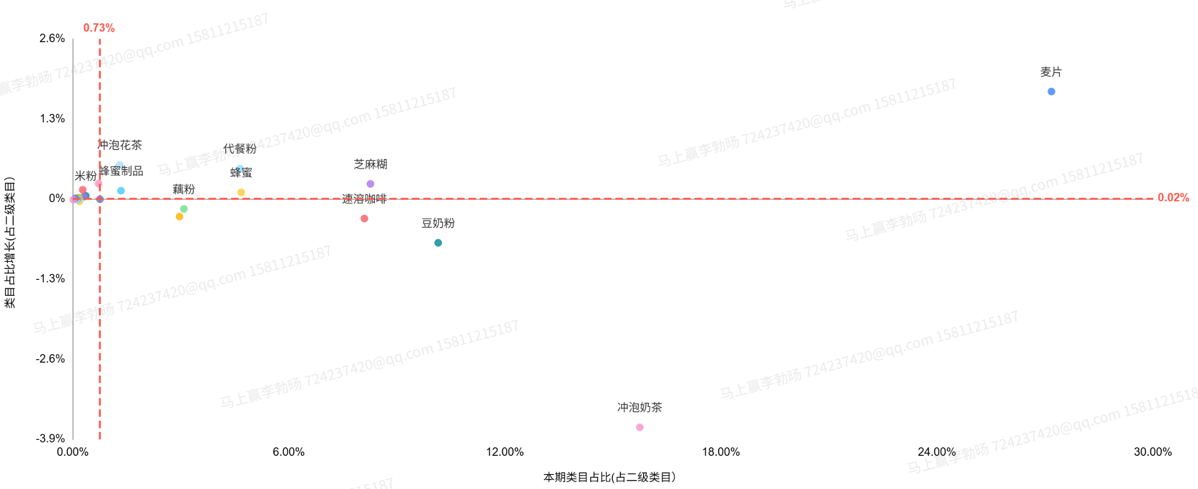 从冲调品大类下各类目的占比及其占比同比增长来看,麦片类目占比全场最高,类目占比增长也远超其他类目;而中小占比类目中,代餐粉、冲泡花茶等类目占比同比增长较为显著。