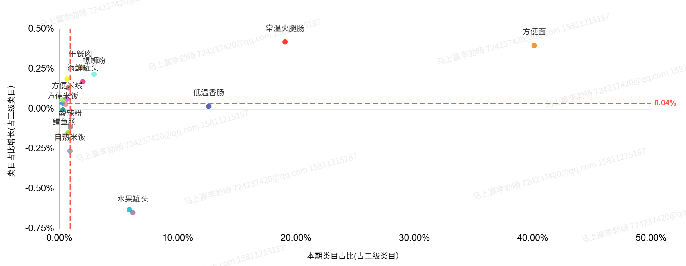 2025年全年,连锁超市业态,方便速食类目-类目占比(横轴)及其同比增速(纵轴)