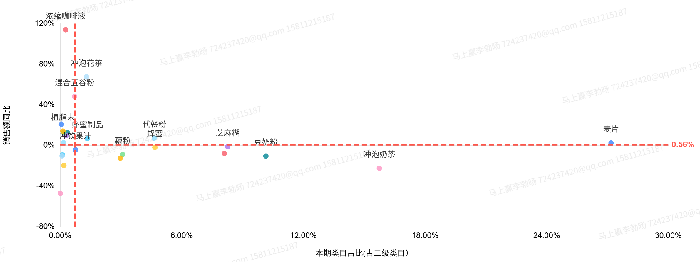 从销售额同比与类目占比来看,麦片占比远高于其它类目,销售额同比也为正基本保持稳定。冲泡花茶、混合五谷粉等类目也表现出较强的增长动能,销售额同比增速均高于大类平均水平。此外,浓缩咖啡液虽然占比较小,但销售额同比增速较高,其中浓缩咖啡液的销售额同比增速将近120%。