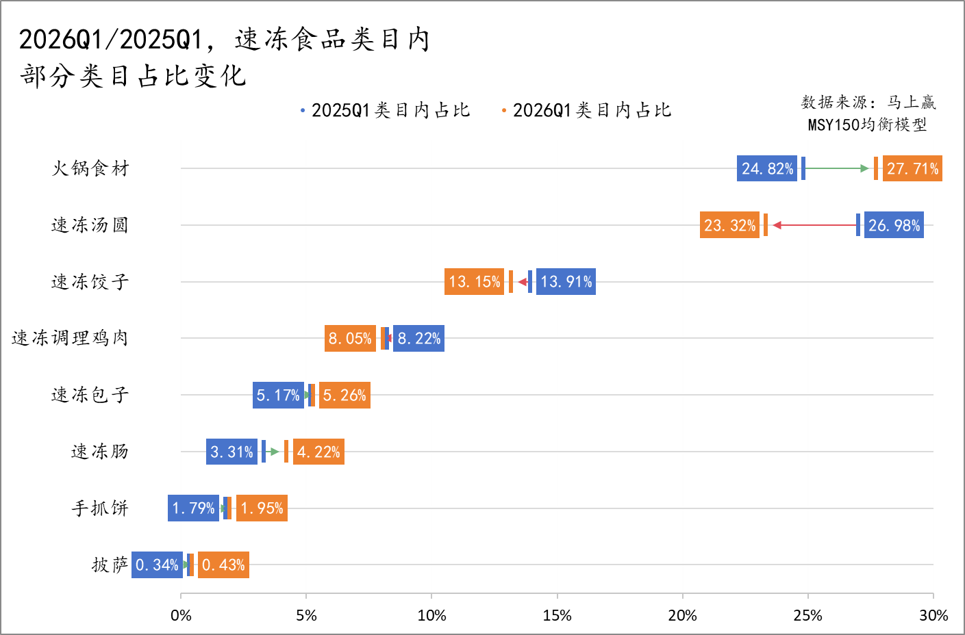 2026Q1速冻食品各类目的占比变化,体现出了速冻食品类目整体或在进行结构性的变化。原本占比较高的速冻食品传统品类如速冻汤圆、速冻饺子,占比均有较为显著的下滑;相比来说,速冻食品类目下的新品类,对应的新场景、新烹饪方式、新食用习惯,其占比则均有上升,例如火锅食材、速冻肠,其占比均有明显的提升。其他类目如速冻调理鸡肉、速冻包子、手抓饼、披萨,占比变化不大仅呈现小幅度波动。