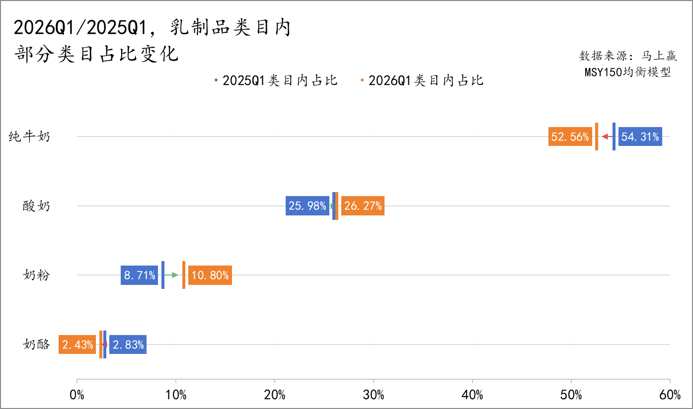 首先看占比变化。2026Q1对比2025Q1,占比超50%的纯牛奶,其占比从54.31%下滑至52.56%,一定程度上反映出消费者需求的多元化,虽然营销概念、低温常温等选择颇多,但基础的纯牛奶的占比依然下行。与此同时,酸奶表现相对稳健,占比由25.98%微增至26.27%。